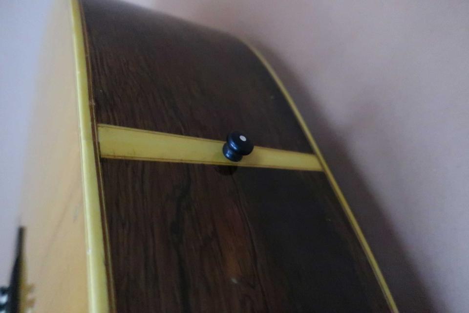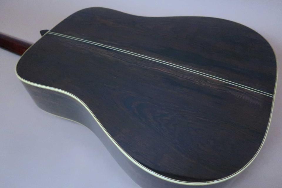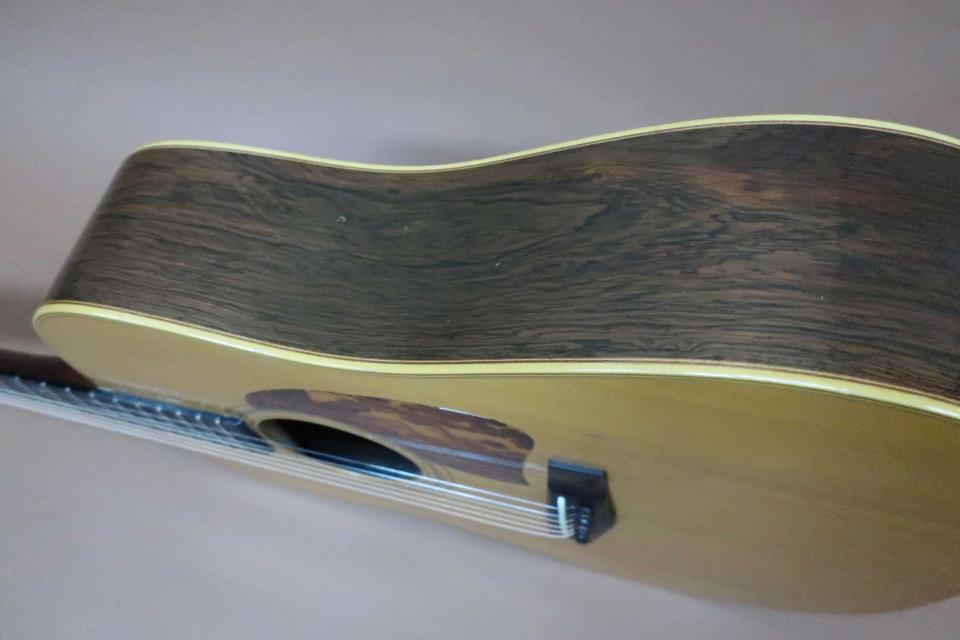 状態はペグの金属劣化も少なく輝いておりトルク調整も簡単に調整可能です。。フレットも殆ど減りが見受けられず、ナット&サドルも牛骨に交換されており、消耗箇所で有るフレットなども含め末長くご使用が可能です。トップのピックガード下やエンド付近に3~4個程度の打コンはタッチアップ処理がされておりスクラッチ傷は殆ど見られません。指板エンドとサウンドホール脇に1センチ程度のヘアーラインクラックが見られたので当店で修理済みです。サイドは軽いポツ打コンぐらいで綺麗なコンデションを保っており、白濁なども見受けられません。バックは右下エンド付近にクラック修理が見られえますが黒いハカランダの縞の箇所なので目立ち難く中央箇所の打コンはタッチアップされており、その他は塗装の艶もあり傷や打コンは少なく綺麗です。ネック裏は極軽微な打コン程度で演奏性も良く、ネックヒールにストラップピンも装着済みです。ピックアップの取付履歴はありません。弦長約645mm、ナット幅約43mm、弦高は12F6弦約2.6mm、1弦約2mm、サドルマージンはセンターで約3mm有りネックを含めプレやビリティも良好です。オリジナルタカベ製ケースも付属しております。クラック修理は有りますが、気になる白濁は奇跡的に無く、ご存知の通りジャーマントップ/ハカランダ仕様は国内外のギターを含め価格が高騰しており、この価格はかなりお買得かと思います。是非ご検討を頂ければ幸いです。