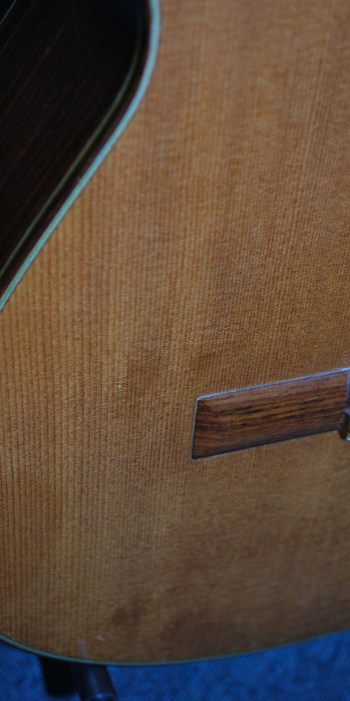 状態としては、サウンドホール右上に少し長いが浅い打痕、表面板にはよく注意しないと判別できないレベルの細かいウェザーチェックが見られる。