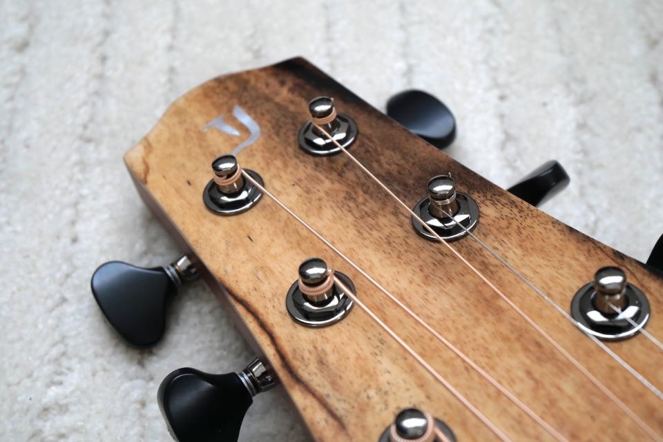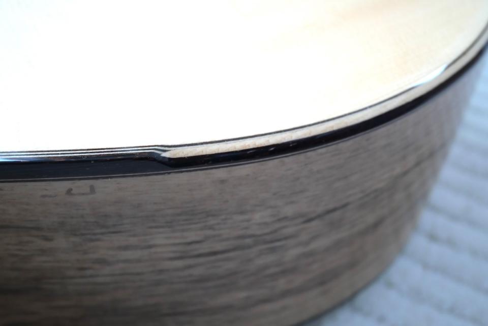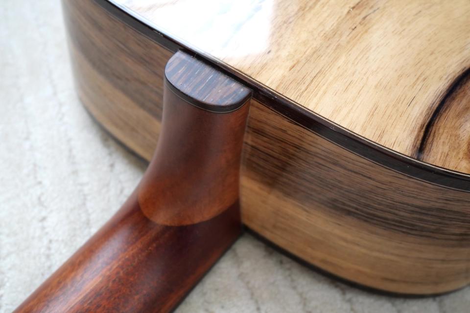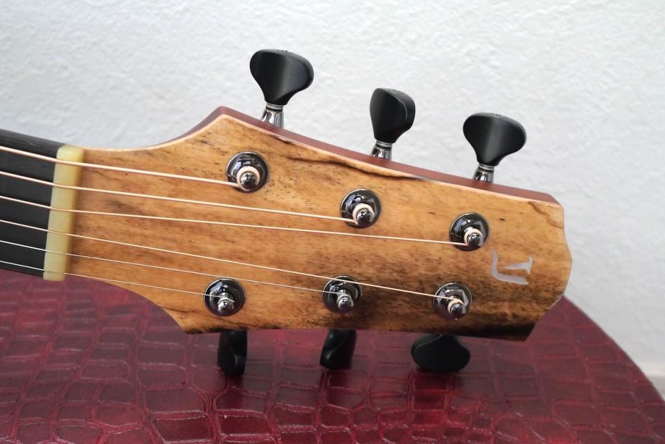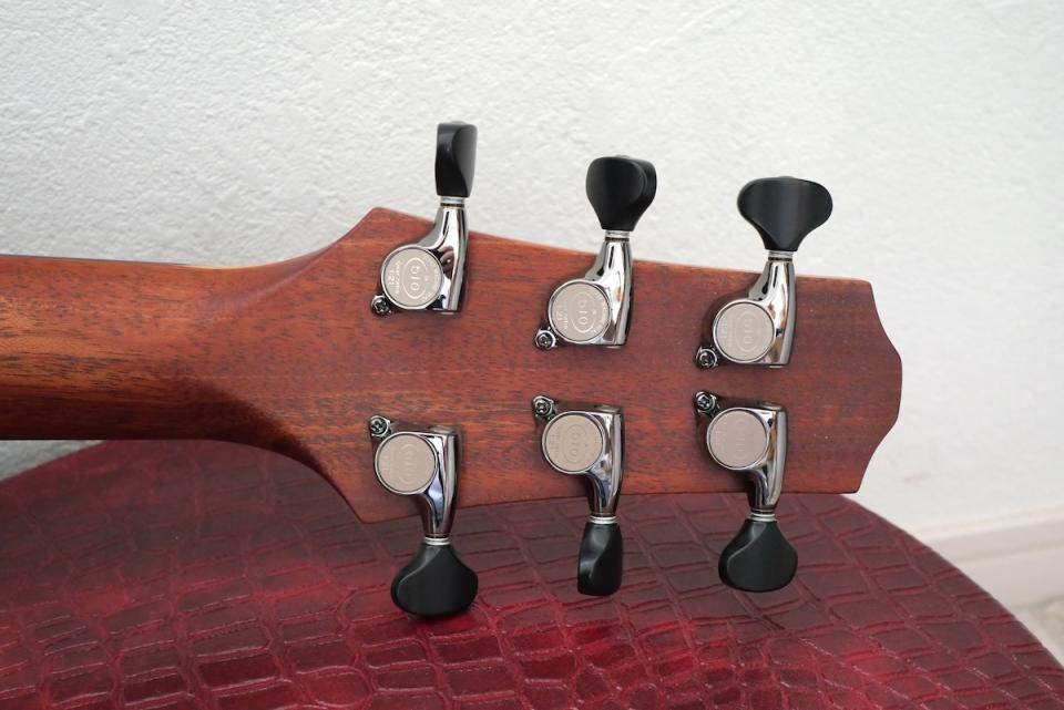 ヘッド天神にはボディ材に合わせて黒柿材、ロゼッタにはエキゾチックエボニーを採用しています。ロゼッタラインのヘリンボーンも相まって、シンプルながら、グッとくるルックスに仕上がっています。