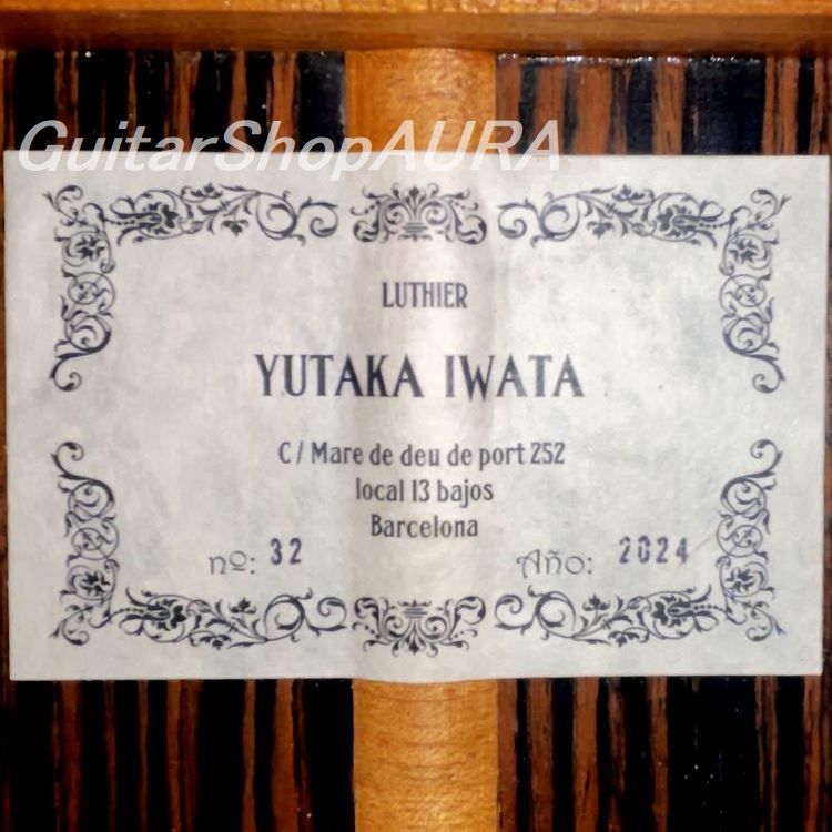 岩田裕(Yutaka Iwata)1972年神奈川県生まれ。2000年に楽器製作工場に就職しクラシックギターの製作を開始します。より深く製作技術を学ぶため長野県に工房を構える製作家石井栄(1947~)に師事し、同工房で職人として働きます。2008年にスペインバルセロナに移住。同地の製作家 ラウル・ヤーグェ Raúl Yagüeを訪問した際に サンチャゴ・デ・セシリア Santiago de Cecilia(María Cecilia Saenz Rols と Juan Santiago Canals の共同製作) の工房で働くことを勧められ、一員として加わり現在に至ります。2018年には自身の工房も設立。サンチャゴ・デ・セシリアでの活動と並行して自身のオリジナルモデルを製作しています。彼曰く、自身の作品は「日本で学んだ細心の技術と、スペインで受け継がれている豊かで伝統的な芸術性の融合」であり、さらには工法や演奏性における現代的なニーズにも柔軟に対応することで生まれた、完成度の高い楽器となっています。師譲りの傾向からか、いたずらに華美な要素を盛らず、慎ましく、そして静かな迫力を持った楽器が彼の特徴となっており、本国スペインをはじめ高い評価を得ています。