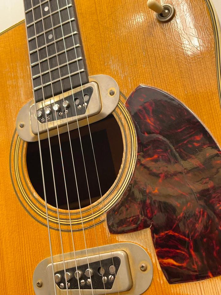 全体的にウェザーチェックがビッシリと入ったヴィンテージらしい貫禄のルックス、ピックガード周りを中心に弾き込まれた傷、細かなダメージ、金属パーツのくすみなどがありますが、見た目よりもコンディションは良好で、ネック状態はほぼストレート、現状の12フレット上弦高は6弦側約2.3mm、1弦側約1.7mm と弾きやすいセッティング、サドルの高さも微調整出来る余裕はあります。