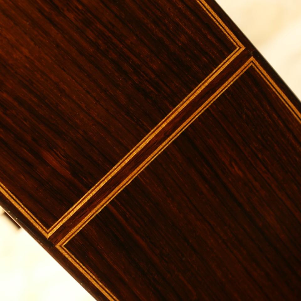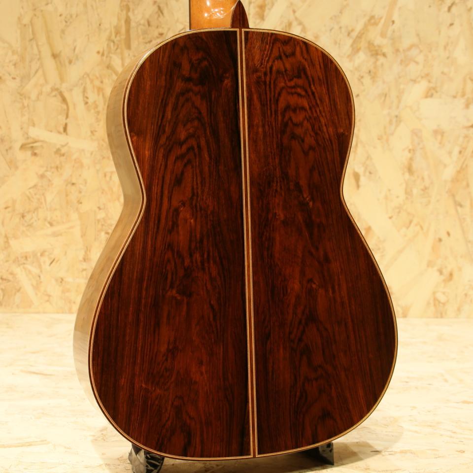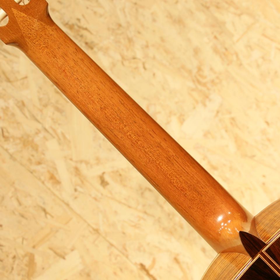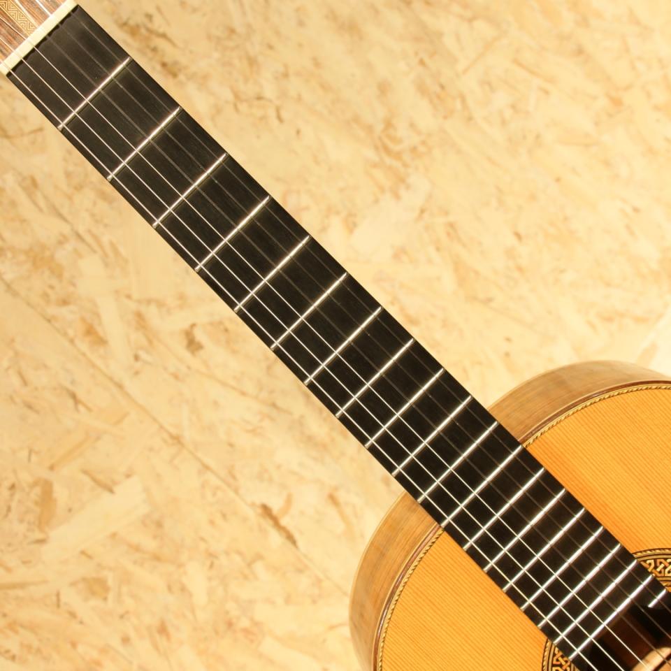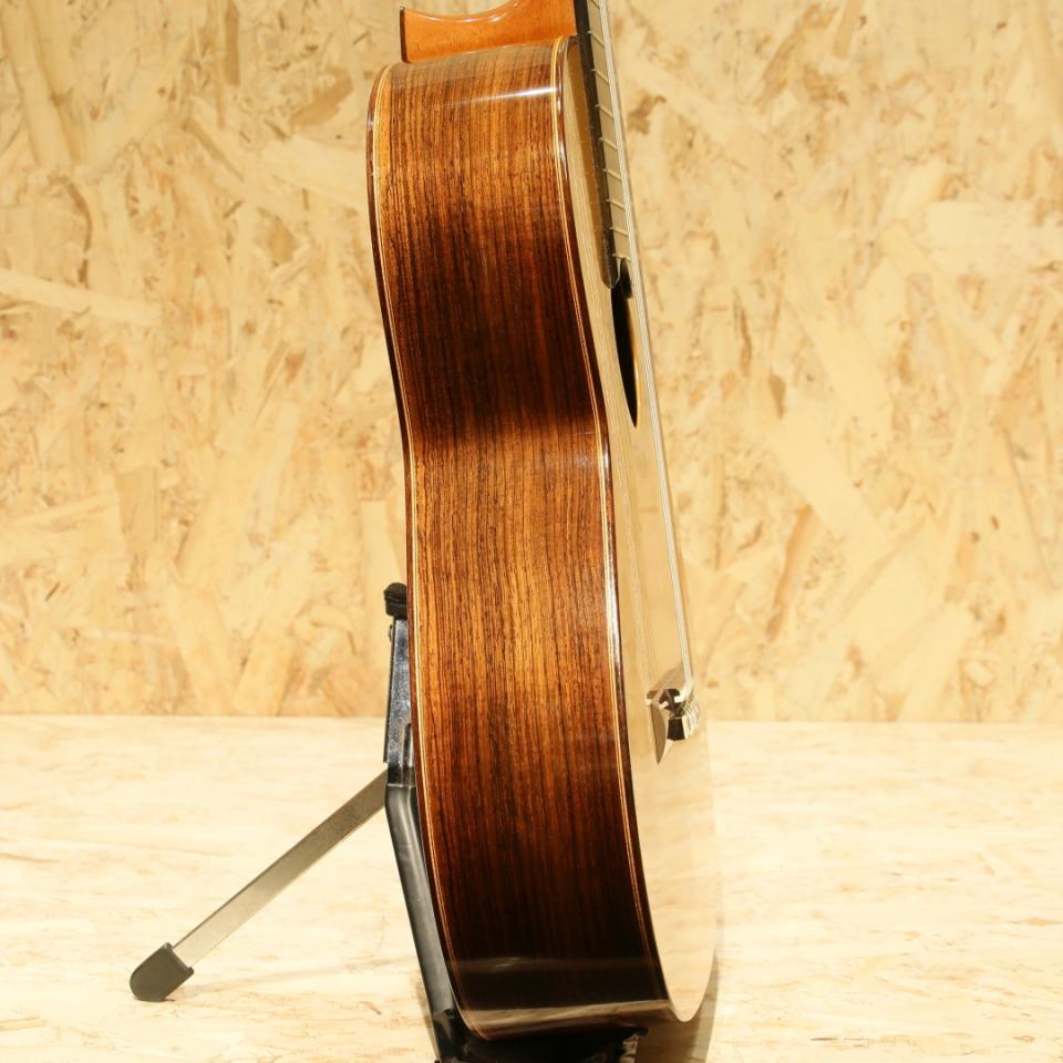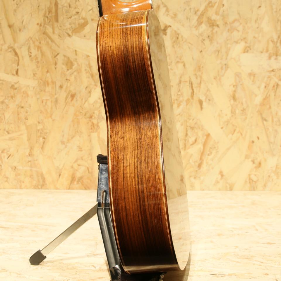 長野の製作家"中野 潤"氏。1989年にメキシコへ留学、その場所で製作家であるルシオ・ヌーニョスと出会い、ギター製作を志します。帰国後、同じく長野県の名工"石井 栄"氏に師事、同氏の工房で自身の作品を製作します。時が経ち1996年にはスペインのグラナダにて巨匠"アントニオ・マリン"に師事。グラナダに受け継がれる伝統的な手法を学び、帰国後、長野県松本に自身の工房を開き、製作を始めました。数々のプロギタリストからの評価も高く、国内でもトップクラスの製作家の一人です。本器は2003年製の1本。スプルーストップ、ハカランダサイド&バック、セドロネック、エボニー指板、ローズウッドブリッジ、オリジナルウッドモザイクロゼッタ、ウッドバインディング、スローンペグ、セラックフィニッシュ、ナット幅約50mm、弦長650mm。内部構造は左右対称の7本の扇状力木を胴底でハの字型に配置された2本に力木が受け止める構造。ヘッドジョイントはヘルマン・ハウザー同様、三角ホゾ継ぎの組み込みです。タッチレスポンスに非常に優れ、軽いタッチでも弾むような出音が特徴です。程よくリバーブ感を含んだ豊潤なサウンド、輪郭はぼやけず比較的スッキリとした音色。実直なトーンは弦を弾いた瞬間から直線状に伸びていく印象、程よいサスティンもあり上質で艶やかな音色が魅力的です。セラック塗装ゆえのボディトップやバックなどに僅かなへこみなど見られますが、雰囲気を損なうようなものは無く、割れ補修などもございません。ネックコンディションも大変良好、演奏性の整えられた状態良好の本器。市場でもなかなか見かけることの無い中野氏のギター、是非この機会をお見逃しなく。汎用ハードケースが付属します。