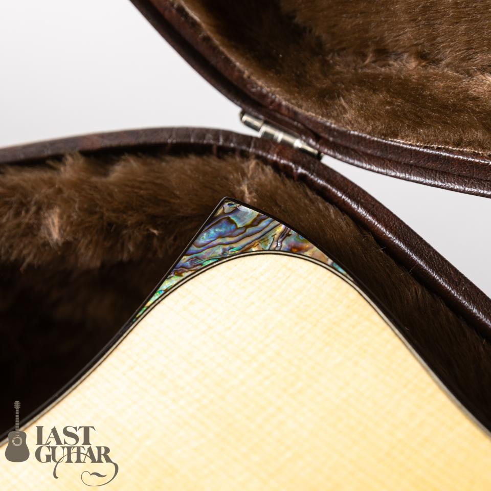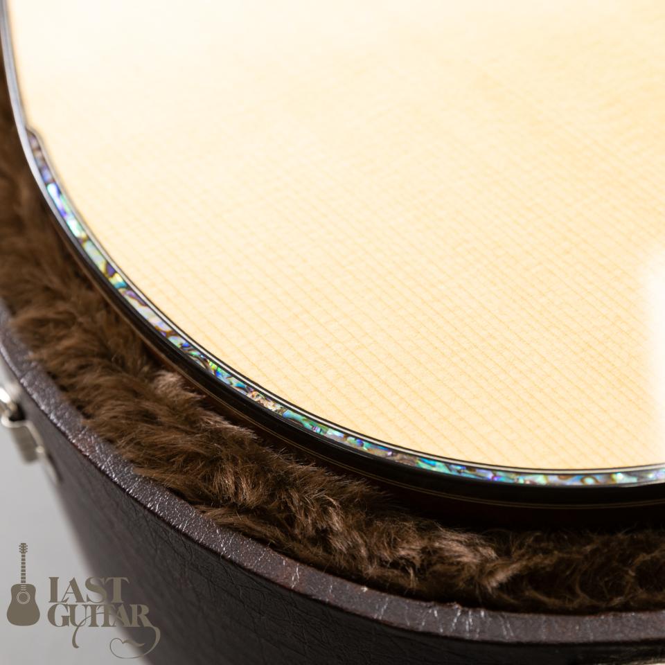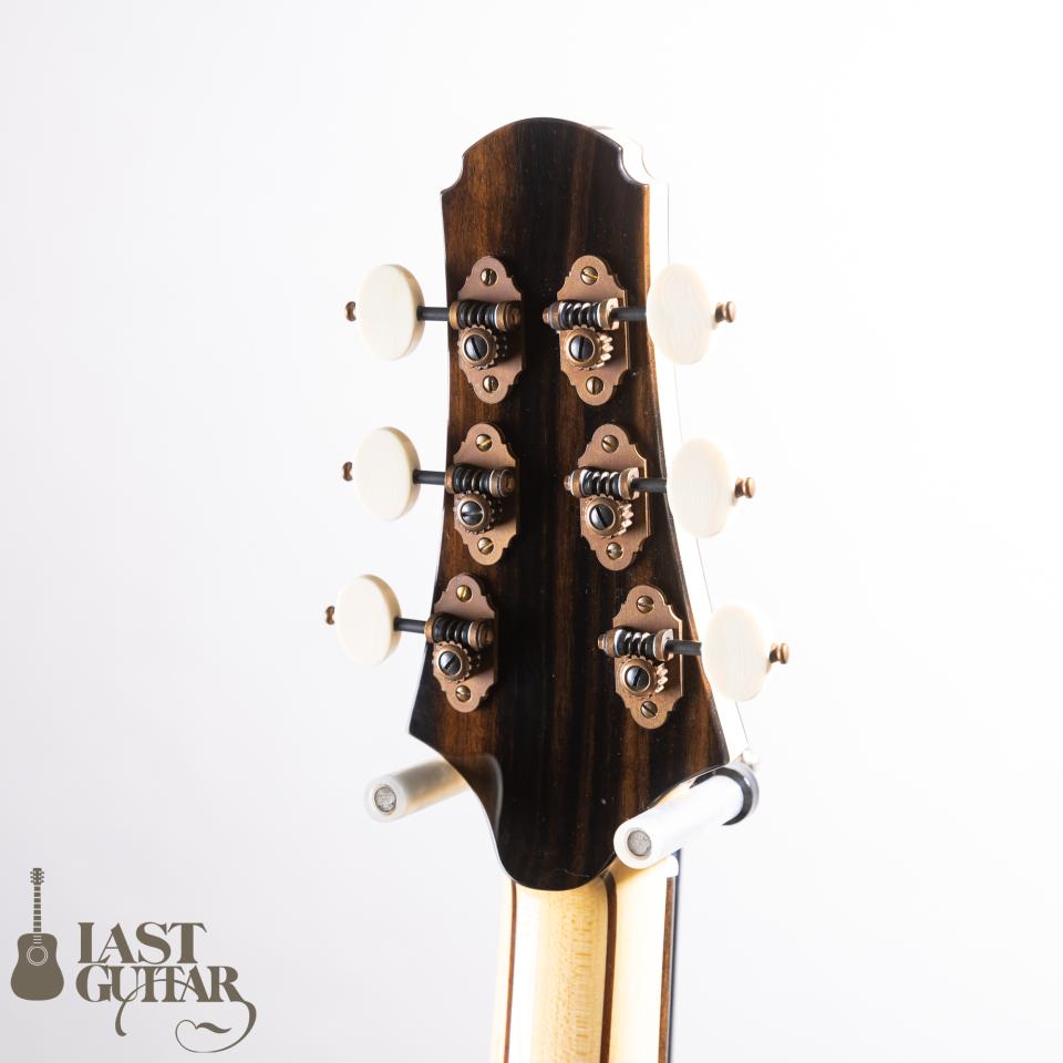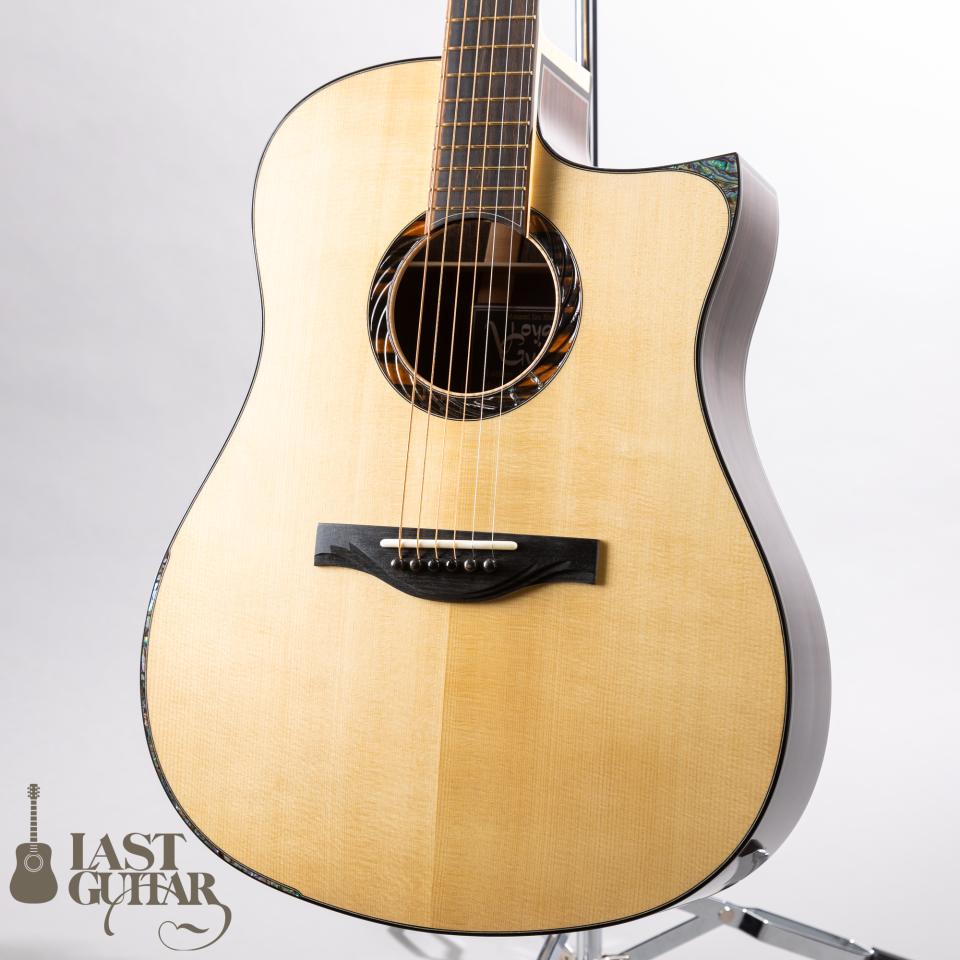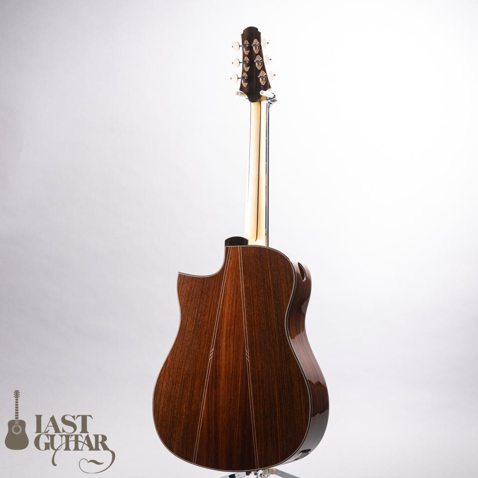 本機は、櫻井氏が新たにトライしたトップ、バックともにキツめのドーミングをかけた構造を持つVDモデルです。メープル・ローズウッド5Pラミネートネック、強めのドーミング、エレベーテッドフィンガーボード、サイドサウンドポートなどが特徴です。またルックス面ではロゼッタやヘッドトップにCNCルーターを駆使した3Dデザインが採用されておりとても美しいです。トップは、上質なジャーマンスプルース、サイドは、インディアンローズウッド、バックは初となる3ピーススタイルのインディアンローズウッド、フィンガーボードは、エボニー、ブリッジは、ロイヤルブラックウッドという商品名の木材で紫色のパープルハートを熱処理した材トリファイドパープルハートです。指板は14-20”のコンパウンドラジアス、フレットはEvo Goldとプレイヤーをより意識したスタイルです。ペグは、ドイツ製ルブナー。音の粒立ちがとても良い印象で、メープルネックによるしっかりとしたミッドレンジとドレッドノートシェイプ特有のレンジの広さがあり、DADGADなどローダウンチューニングをメインで使用する方には特にお勧めです。ケースは、掲載のハードケースが付属いたします。