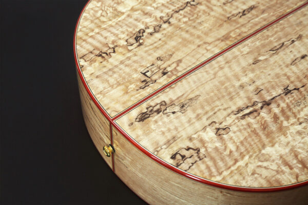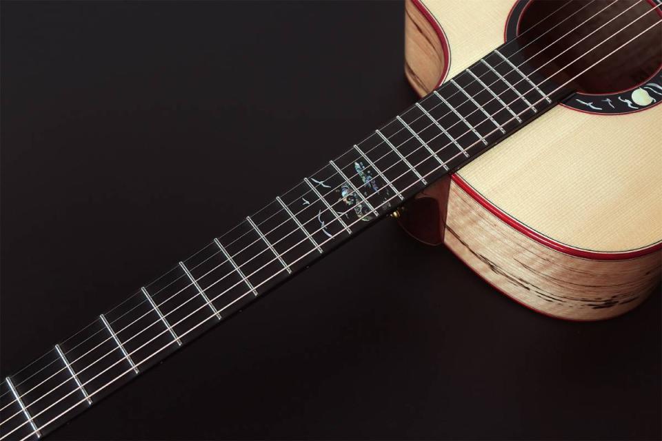 バック&サイドにスポルテッド・メイプルの単板を使用。スポルテッド・メイプルはその独特の杢目が人気ですが、素材としては極めてレアであり、割れも発生しやすいため取扱いが難しく、アコースティックの単板として使用できる材は非常に限られています。メイプルならではの明るい音色が特徴で、フィンガーピッカーのスピーディーでダイナミックな演奏に確実に応えるモデルです。