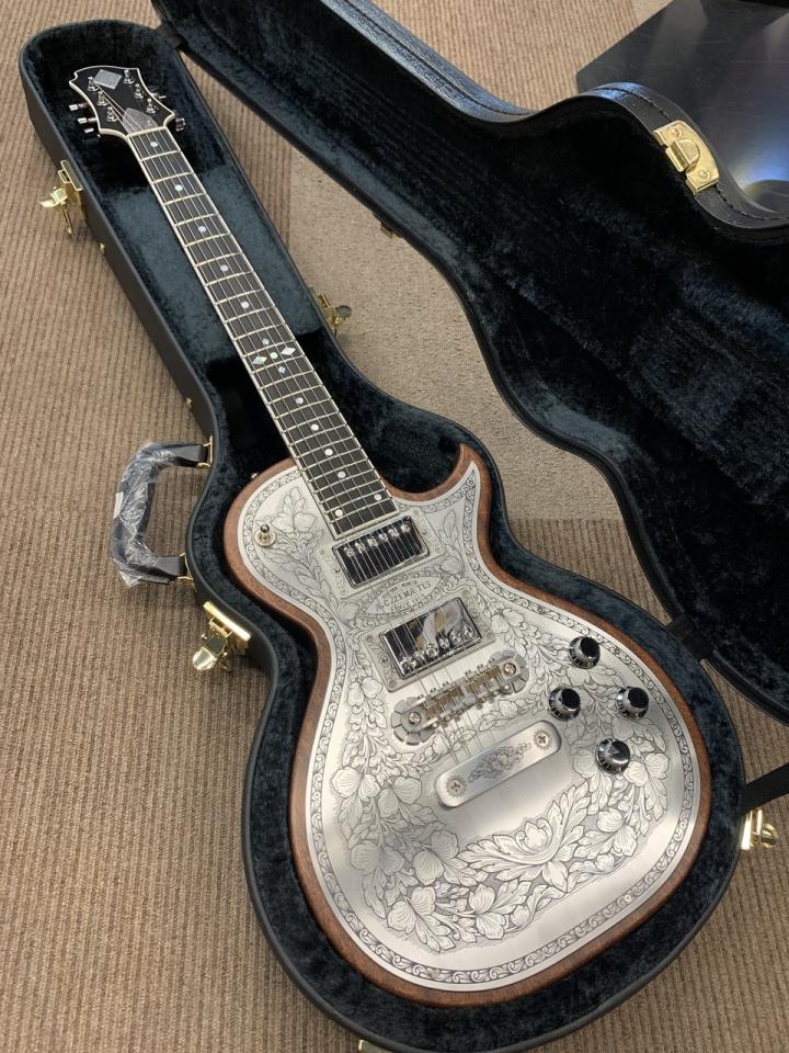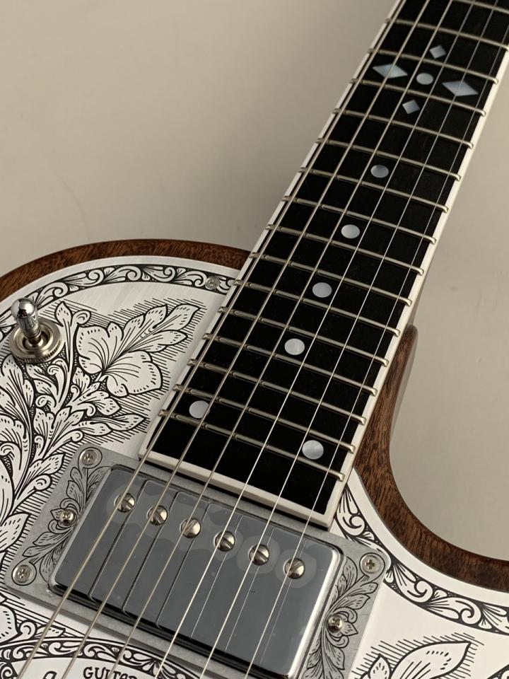 同様にアルミ合金を用いたヘッドのダイアモンド・エンブレム、トラスロッド・カバー、テイルピースやピックアップ・リングをはじめ、アウトプット・ジャック・プレート、コントロール&スイッチ・バック・プレートに至るまで彫金を施しています。