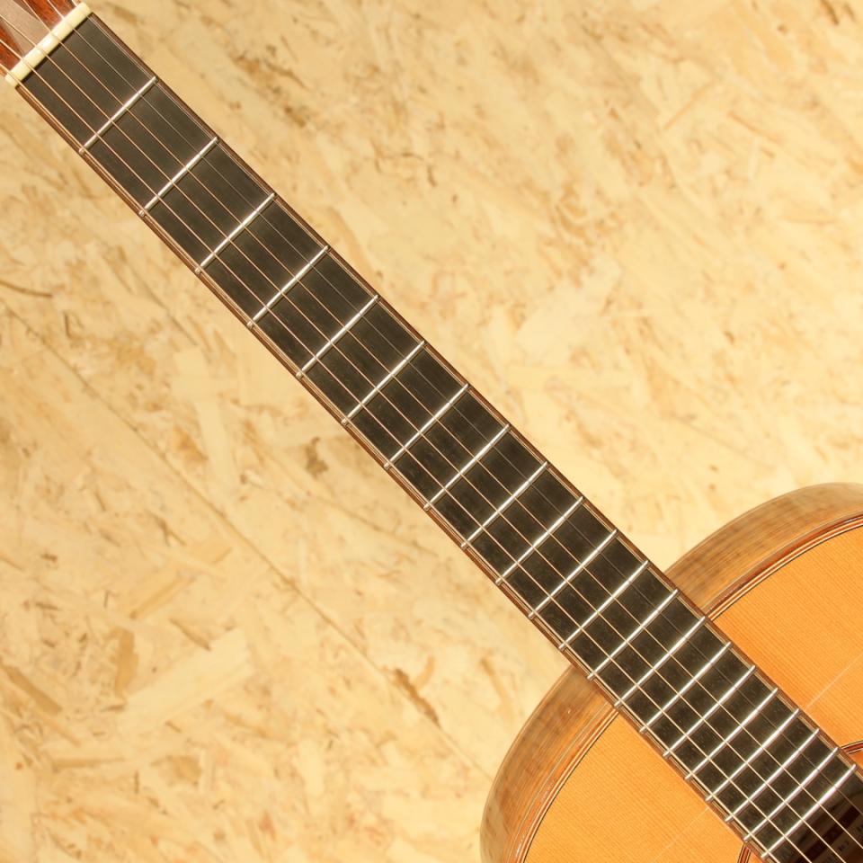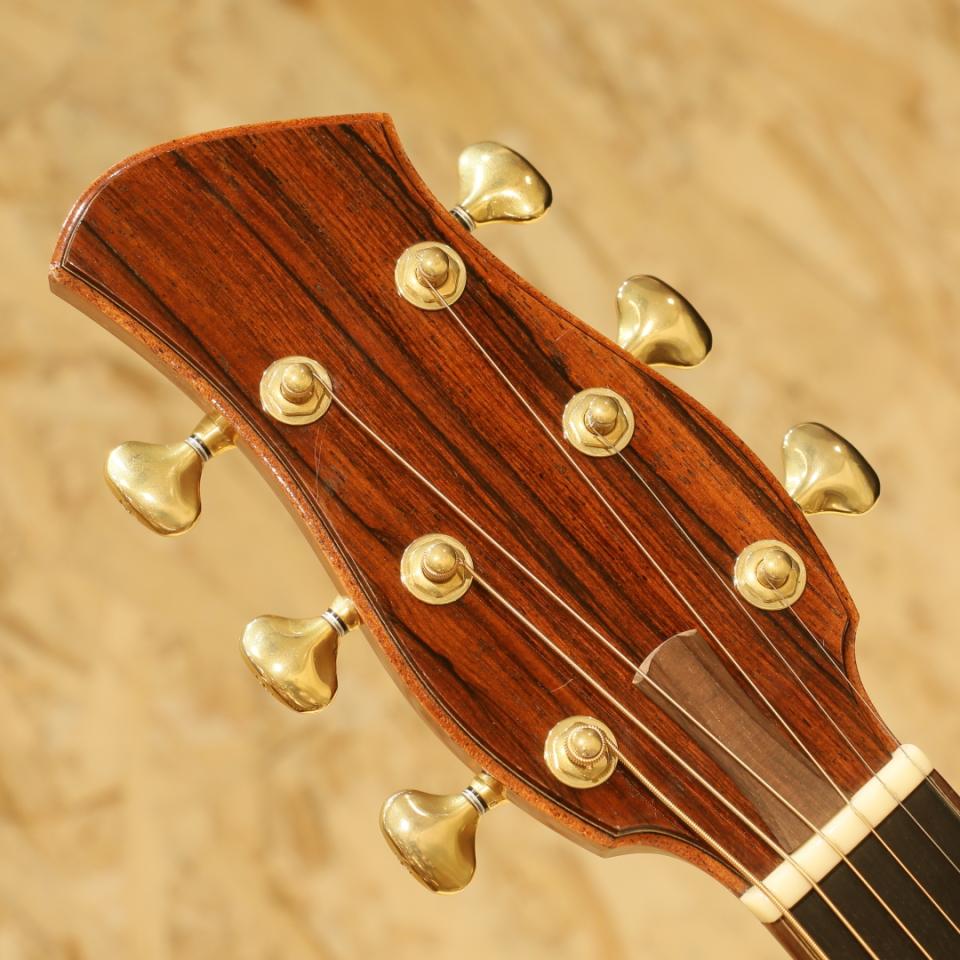 卓越した技術を持つ日本人ルシアー藤井圭介氏。富山県に自身の工房を構え、その技術を注ぎ込み渾身の作品を製作しています。本器は2012年独立後3本目に作られたモデルです。藤井氏の技術を存分に味わえる初期作品でシンプルかつ飽きの来ないデザインが特徴です。トップに上質なシトカスプルース、サイドバックは端正に柾目取りされたインディアンローズウッドを使用。エボニー指板、ハカランダブリッジ、ゴトー510ペグ、レースウッドの杢目を活かしたロゼッタ&バックストリップ。ヘッド化粧板にはマダガスカルローズをトップに、ブドウ杢の楠木をバックに使用した美しい仕上げで全体的にウッディな仕上りとなっています。トップ&バックブレイシングにラティス構造を採用しており、OMサイズとは思えない膨よかな空気感を有します。ストレートなスタイルですが、弦タッチを逃さない繊細な造りで、ミニマムタッチをどこまでも再生し表現してくれます。決して埋もれず煌びやかなトーンで、いつまでも弾いていたくなる見た目通りの美しい仕上りです。細やかな打痕などは多少見られますが、使用感は殆ど感じられずとても良いコンディションをキープ。ネックコンディションも大変良好でとても良好なプレイコンディションです。緻密な作り込みは昔も変わらずで、現在とはまた一味違く解釈のアイテムは藤井ギターファンならずとも心つかまれる音色です。ぜひお手に取ってお楽しみください。