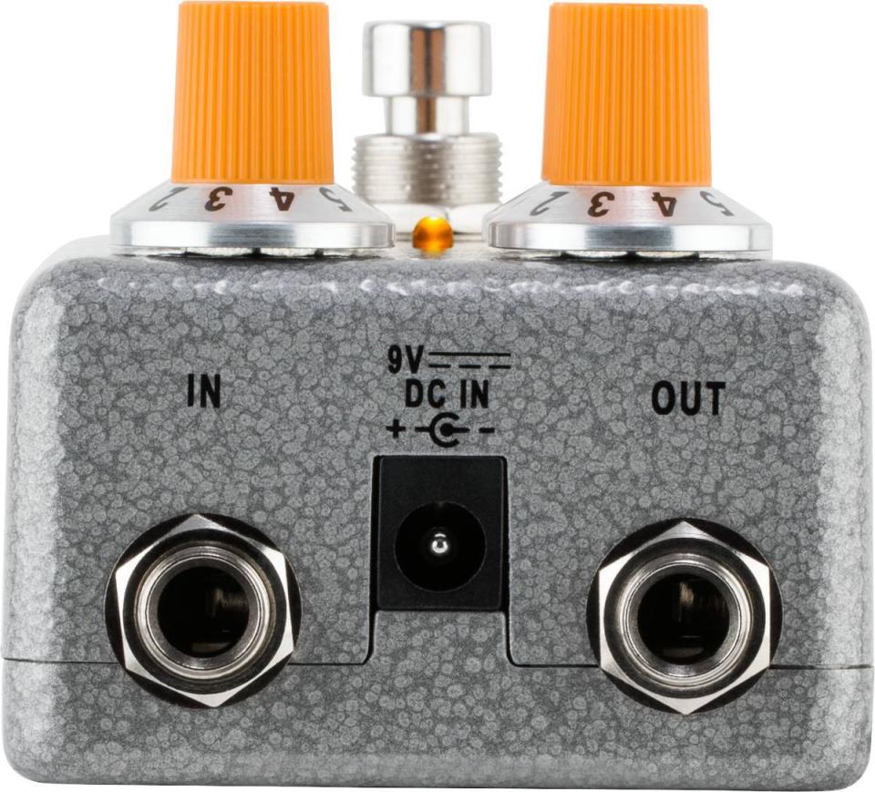 堅牢度の高いシルバーの 4.375” x 2.375” x 1.25”サイズの筐体にはペダルボード上での使用を想定し、インプット/アウトプットのジャックを上部にまとめるという工夫が成されています。