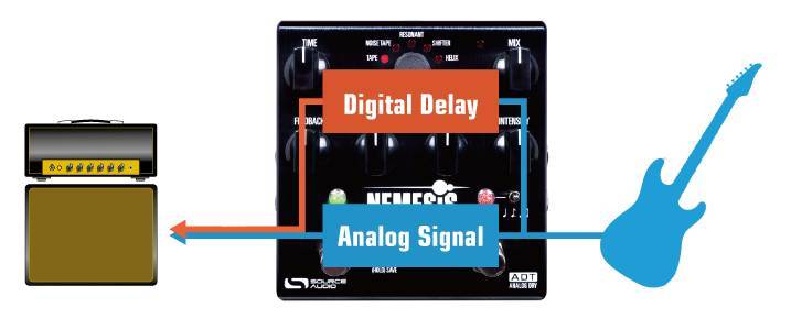アナログ・ドライ・スルー信号パス ? 入力されたドライ信号は処理されず、ウェット(ディレイ)信号とアナログ・ドライ信号がパラレルで出力されます。