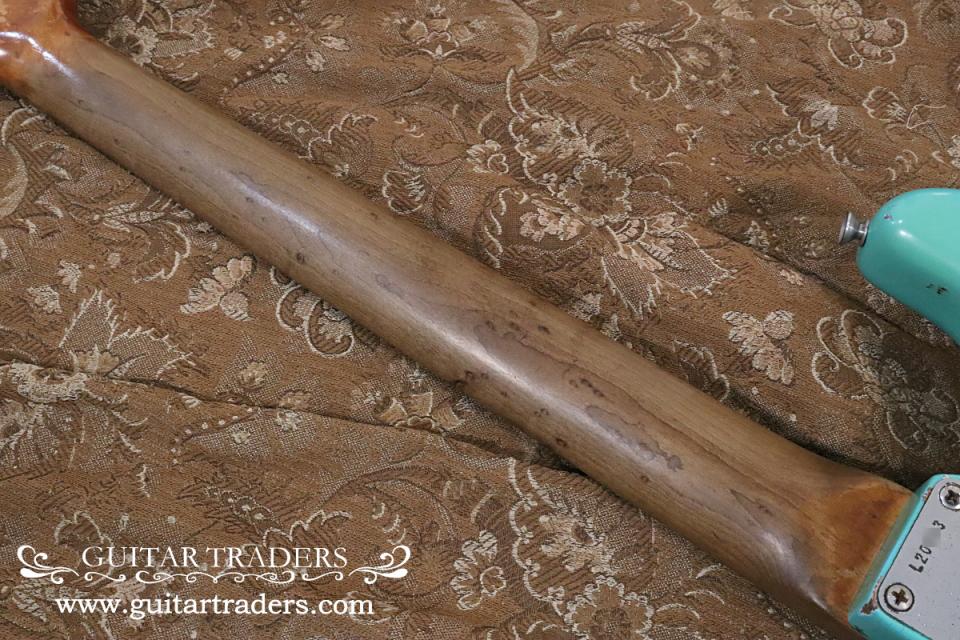 カスタムカラー・サーフ・グリーン・フィニッシュにリフィニッシュが施されたボディを持つ、64年製・ストラトキャスター!