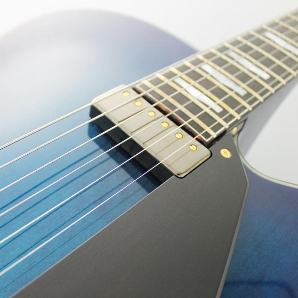 当モデルは、スプルーストップ・カーリーメイプルサイドバックボディ、エボニー指板の組み合わせ。トップ材の響きを最大限に活かすため、ほとんどのハードウェアパーツがボディに穴を開けないでいい仕様のものです。ピックアップもフローティングタイプのものを採用しています。フルアコの中でも特に鳴りを大事にしたい、という方は是非こちらのMFA-FPをお選びください。