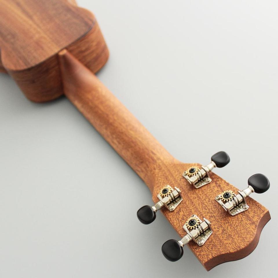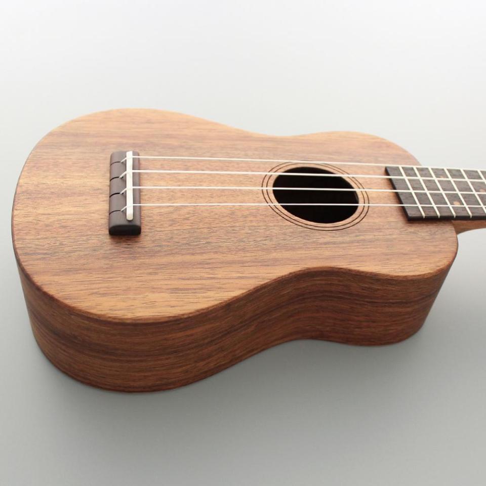 当モデルは、単板アカシアコアボディ、マホガニーネック、ローズウッド指板という、ソプラノサイズのウクレレ。塗装はナチュラルのマット仕上げで、木の質感もお楽しみいただけます。シンプルで飽きのこないルックスですが、アカシアコア材の個性的な木目も魅力です。