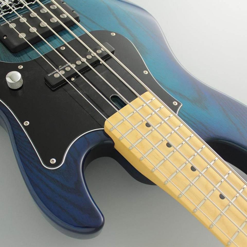 当モデルは、アッシュボディ、メイプル指板、シースルーブルーバーストカラーという組み合わせの5弦ベース。アッシュボディにシースルーブルーバーストカラーという王道の組み合わせの美しさは、絶対的な人気もうなずけます。