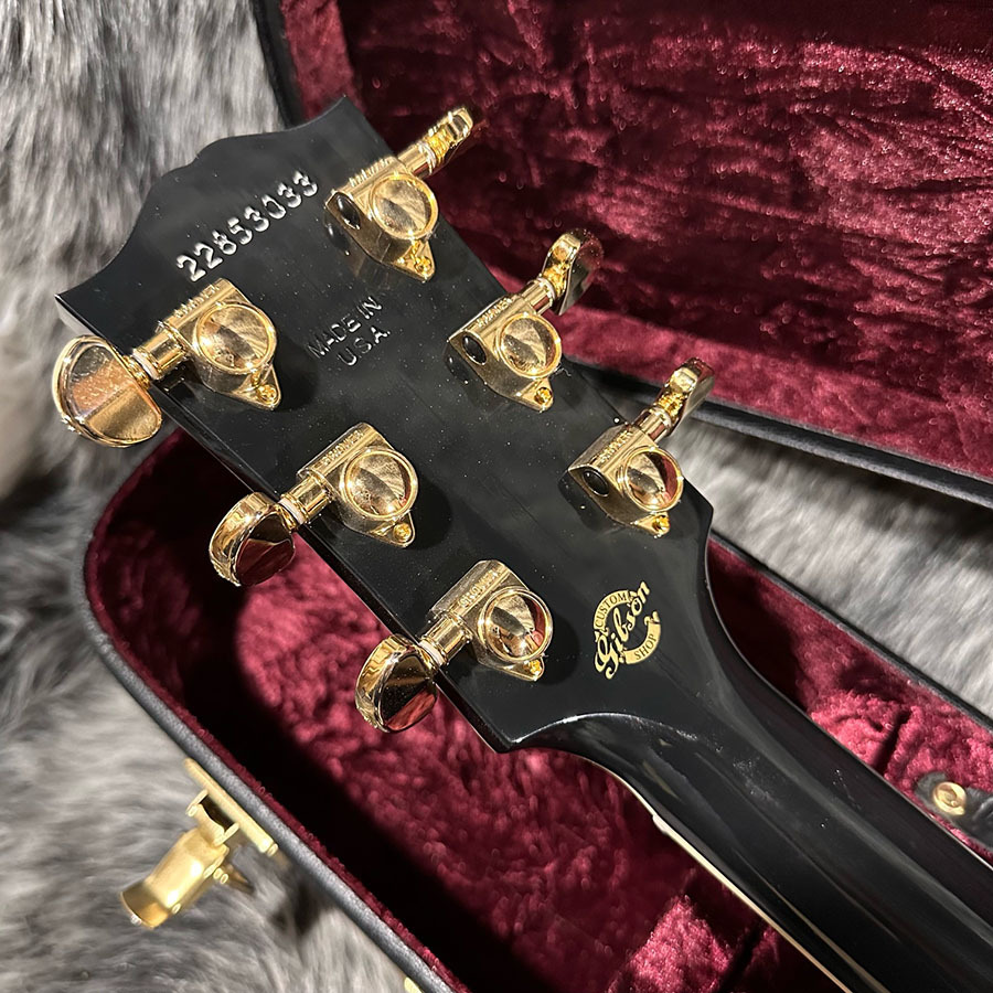 SJ-200 Customはレスポール・カスタムにインスパイアされた意匠が施されています。エボニーカラーのニトロセルロースラッカー・フィニッシュ、トップとバックの多層バインディング、レスポール・スタイルのヘッドストック、マザー・オブ・パールのカスタム・スプリット・ダイヤモンド・インレイ、バインディングの施されたエボニー指板、マザー・オブ・パールのカスタム・ブロック・インレイ、ゴールドのGrover Rotomaticチューナー等、充実した仕様を誇ります。