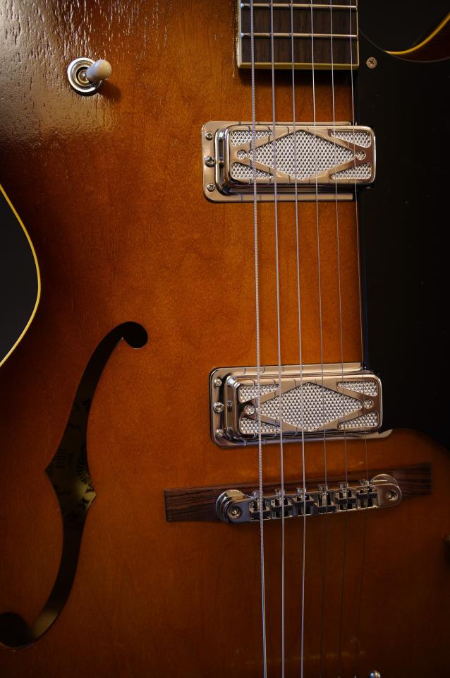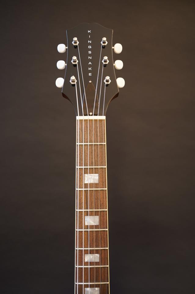 公式には17インチボディのDetroit Oneをサイズダウンし、スケールもミディアムスケール(628mm)に変更した、とありますが、かつてのDeArmond Golden Toneそっくりのピックアップや、独特なレトロなカラーリングなどまるでHarmony Rockを彷彿とさせるルックスに思わずニヤリとする方も多いのではないでしょうか。そんな1960年代のビザールなフルアコを現代のクオリティで再現し、さらにKing Snake独自のアレンジでよりハウリング耐性の向上などプレイヤビリティを向上させた一本です。