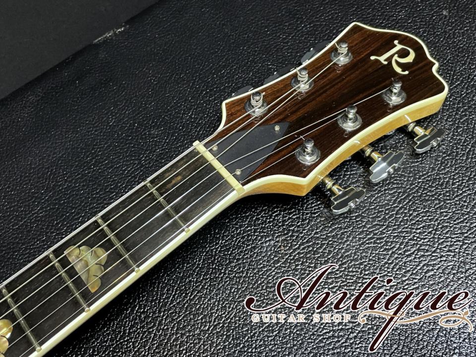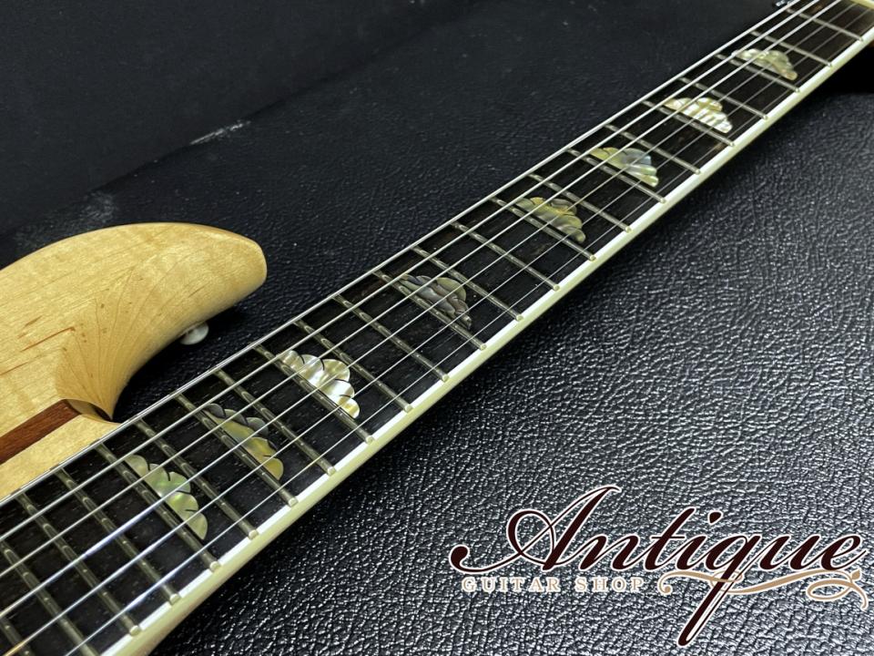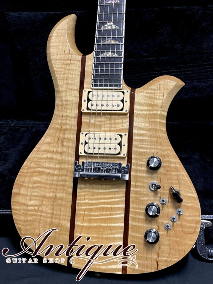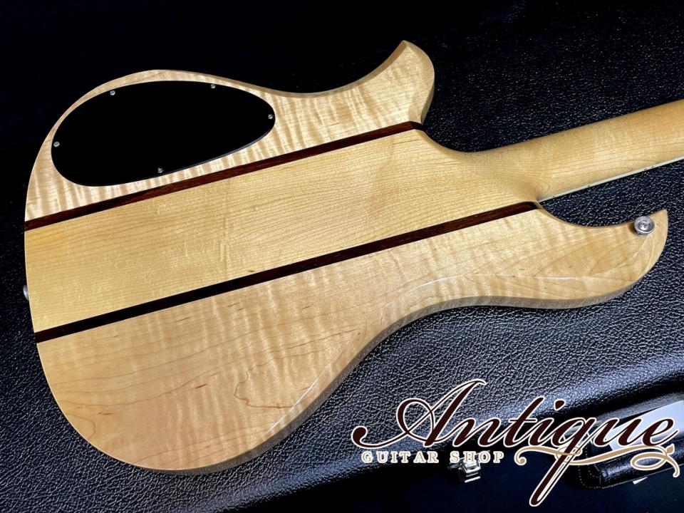 まずそのスペックとして、ボディ構造は上位モデルお馴染みのスルーネック構造となりますが、この時期としては類を見ない程のグレードとなる最高峰の材が採用されております。メイプルネックにメイプルウイング、ウォルナットストリップからなるウッドマテリアルにて、ウイング部分となるボディのソリッドメイプルは、どの角度から見てもギラギラに波打つ強烈過ぎる3Dフィギュアドが浮かび、またエキゾチックウッド寄りのワイルドな杢目と併せて多数のフレックが入っております。スルーネック構造となるメイプルは、ウイングボディ部程ではありませんが、こちらもフィギュアド&フレックの入った極上材となっており、またボディトップ側はおそらくウイングボディ材と同一の材から切り出したと思われる強烈なフィギュアド材がラミネイトされております。またほぼオールメイプルとなる重厚なウッドマテリアルながら、総重量は約4.05kgと軽量に仕上げられている点も特別な一本だと感じさせます。指板には他ブランドでも上位機種に採用される高級材となるエボニーにて、バインディングと併せて豪華なアバロンによるクラウドインレイが施されておりますが、中でも9F部と12F部のアバロンは虹色に光輝く極上過ぎる発色を魅せ付けます。その他としてはバインディングが施されたウォルナットのヘッド突板にブランドロゴである”R”のパールインレイ、トライアングラー・トラスロッドカバー、ステアステップボタンのGrover製インペリアルチューナー、バダスブリッジ、クリームカラーのエスカッション&ピックアップカラー、ハードウェアはクロームカラーで統一、ヘッド裏には製作者であるバーニー・リコ氏の手書きサイン、併せてMADE IN USAデカールが貼られております。