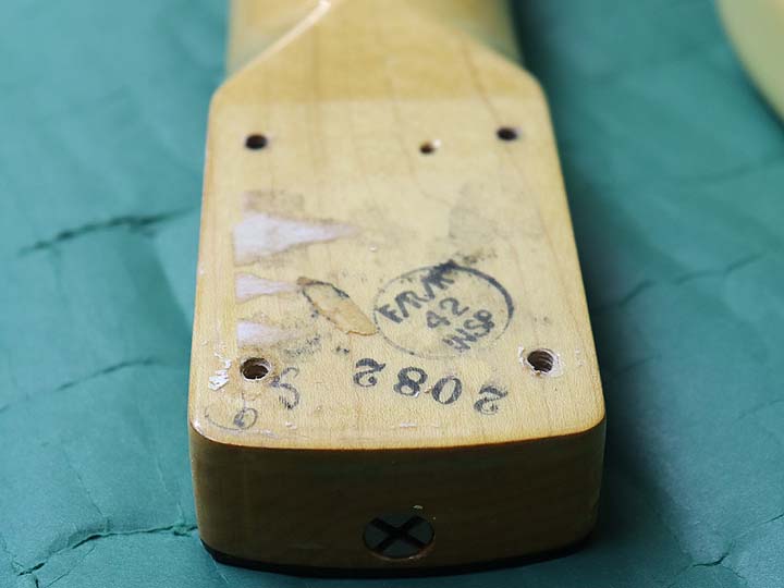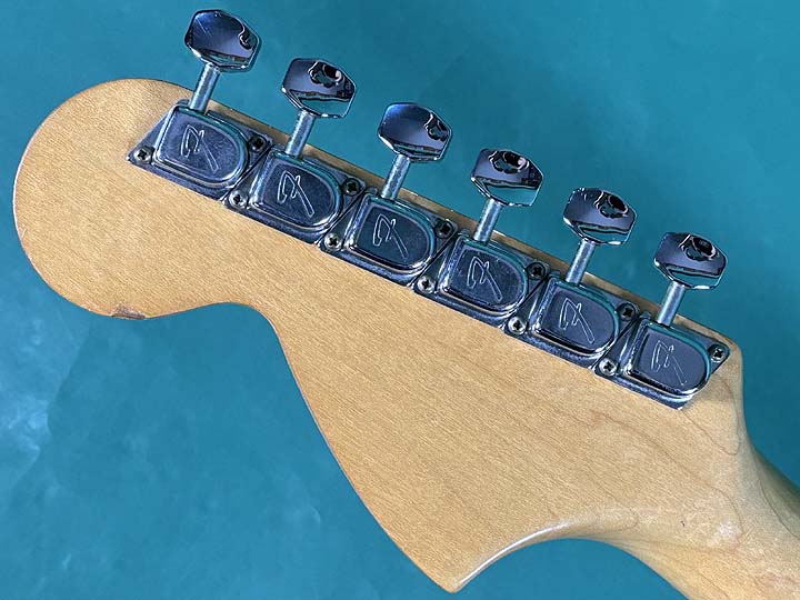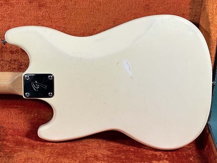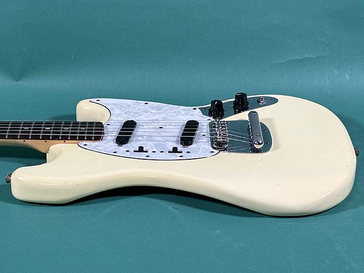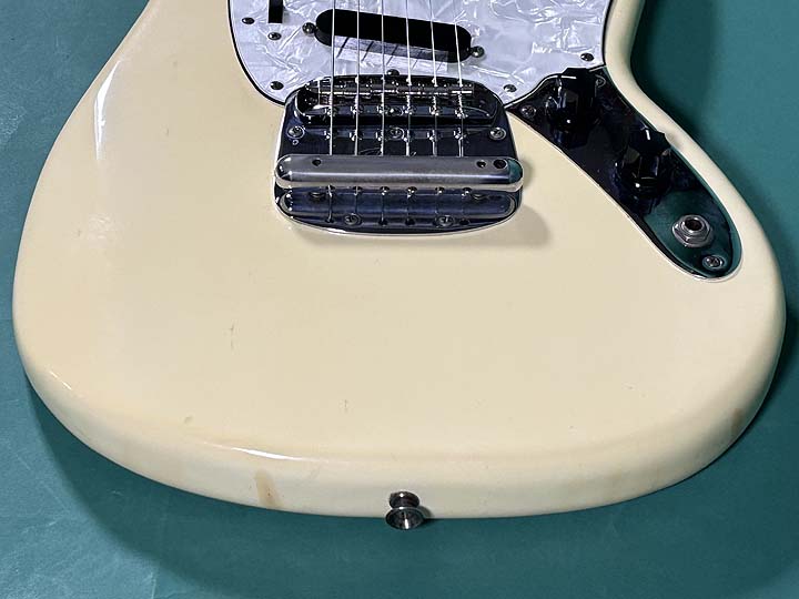 トップには細かなポツキズやウェザーチェックが見られます。バックには年代相応のバックル傷が見られ、ボトム部分にはスタンド負けが確認出来ます。またジャック付近のサイド部分には、500玉程の浅い打痕があります。またネックジョイント部分には、定番のウェザーチェックが見られます。ネック裏の1F、3F辺りにはゴマ粒程の打痕が幾つか確認出来ます。またヘッドバックの角には米粒程の打痕と塗装のチップがあります。ネックエンドにはデイトのスタンプが押されておらず、「MUSTANG」とだけスタンプが押されております。