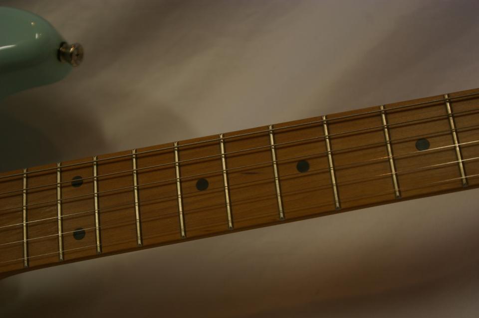 ピックガードやノブにミントカラーのパーツを採用し、オールドギターの風格を漂わせるルックスに仕上げました。