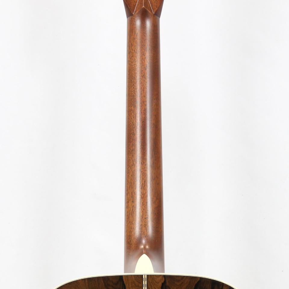 その他スペックとして、マホガニー材ネック、ブラックエボニー材指板&駒、スプルース材ブレイシング( Xブレイシング・スタンダードスキャロップド)、ナット幅は44.5mmのModified Low Ovalプロファイルネック、MARTINオールドスタイル・デカール(シルバー)、ヘリンボーントリム、ダイアモンド&スクエア指板インレイ、Waverly 4060ペグ、ドロップインタイプのロングサドルと、戦前のマーチンギターに近づけたルックス、仕様になるようオーダーしております。