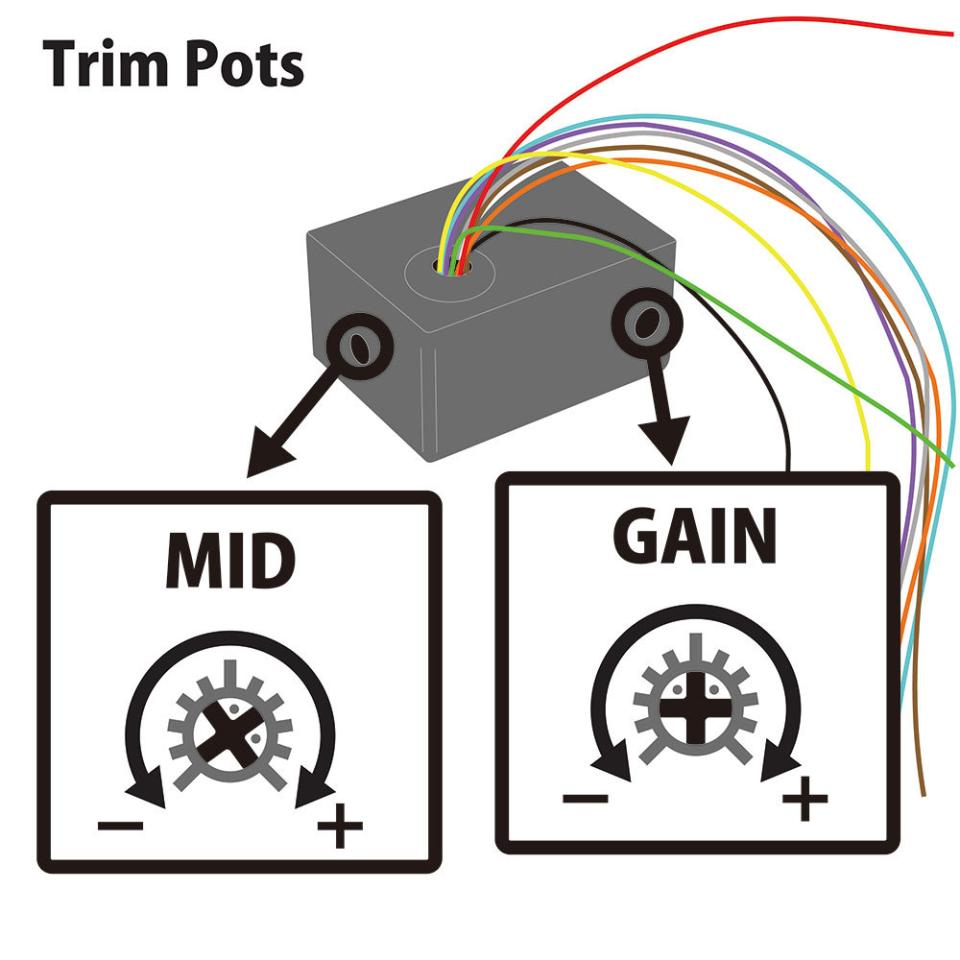 フロントのコントロールは、2VOL、2EQ(BASS・TREBLE)、裏のキャビティ内にGAINとMIDのトリムポットがあり調整が可能です。フロントでのシンプルな操作性にこだわりつつ、GAINとMIDでお好みの出力・サウンドキャラクターをさらに調整することができるようにしました。スペックは以下の通りです。