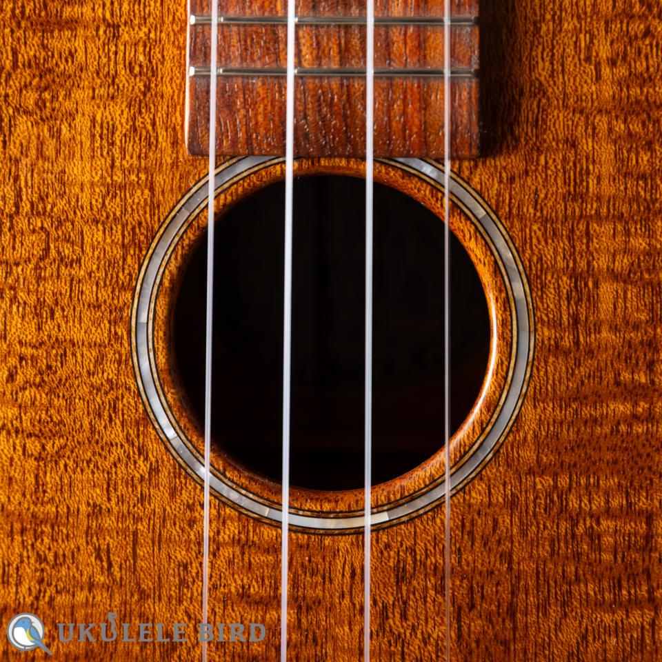 本楽器はクラフトムジカオリジナルシェイプのコンサートで、ボディは極上グレードのホンジュラスマホガニーです。しかもトップ材とバック材は1ピースで贅沢に使っております。目が詰まって非常に美しく、繊細かつサスティーン豊かな音色です。