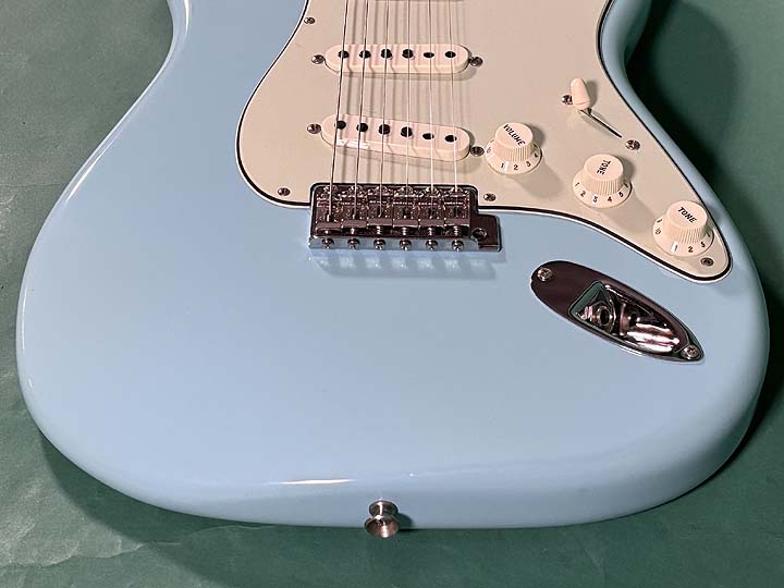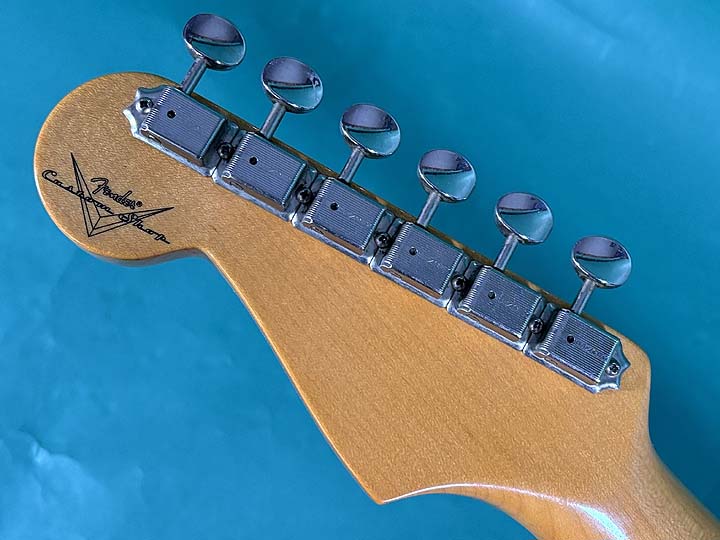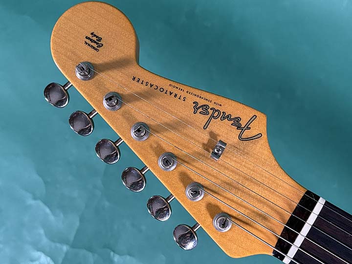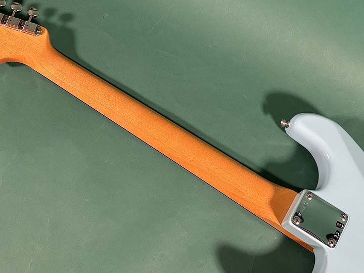 ボディはアルダー、ネックはメイプル、指板はローズウッド、ピックアップはオリジナルのハンドワイヤリングされた、HW59STRATが3基マウントされております。指板ラジアスは7.25インチから9.5インチと、ローポジションからハイポジションにかけてフラットになるコンパウンドラジアスとなっております。