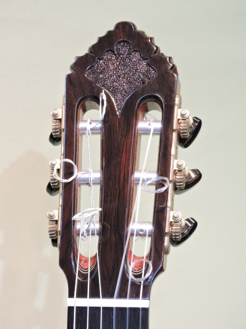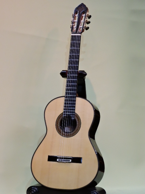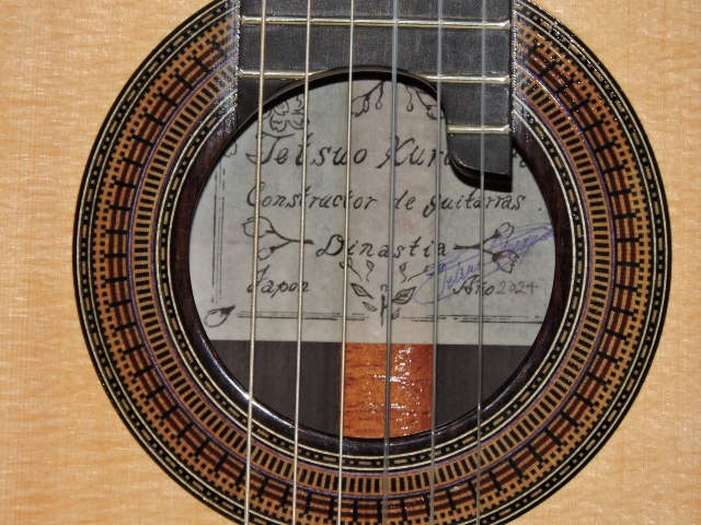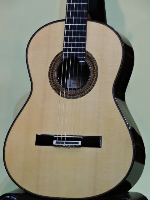 この作品は哲郎氏独自のラティス構造の標準的ディナスティア・モデルとは違って伝統的なファンブレーシングで製作されているせいか、音に伝統的なスペインギターの色合いを感じさせつつも完璧な全弦のバランスを実現しています。