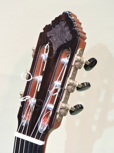 全体的なデザインもスペイン古名器のM.ラミレスやF.シンプリシオを想起させ、特にロゼッタの太いラインは哲郎氏のスペインギターに対する憧憬がそのまま反映されています。