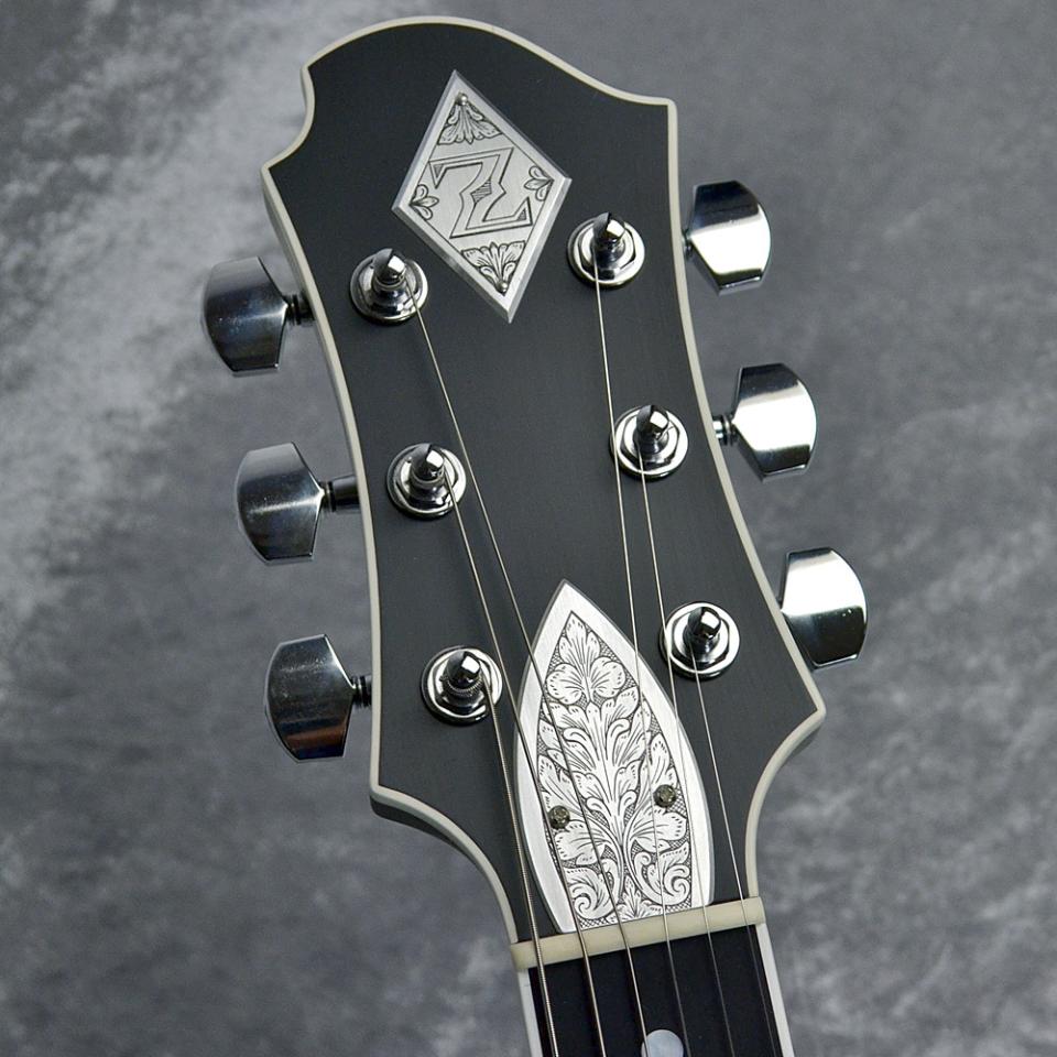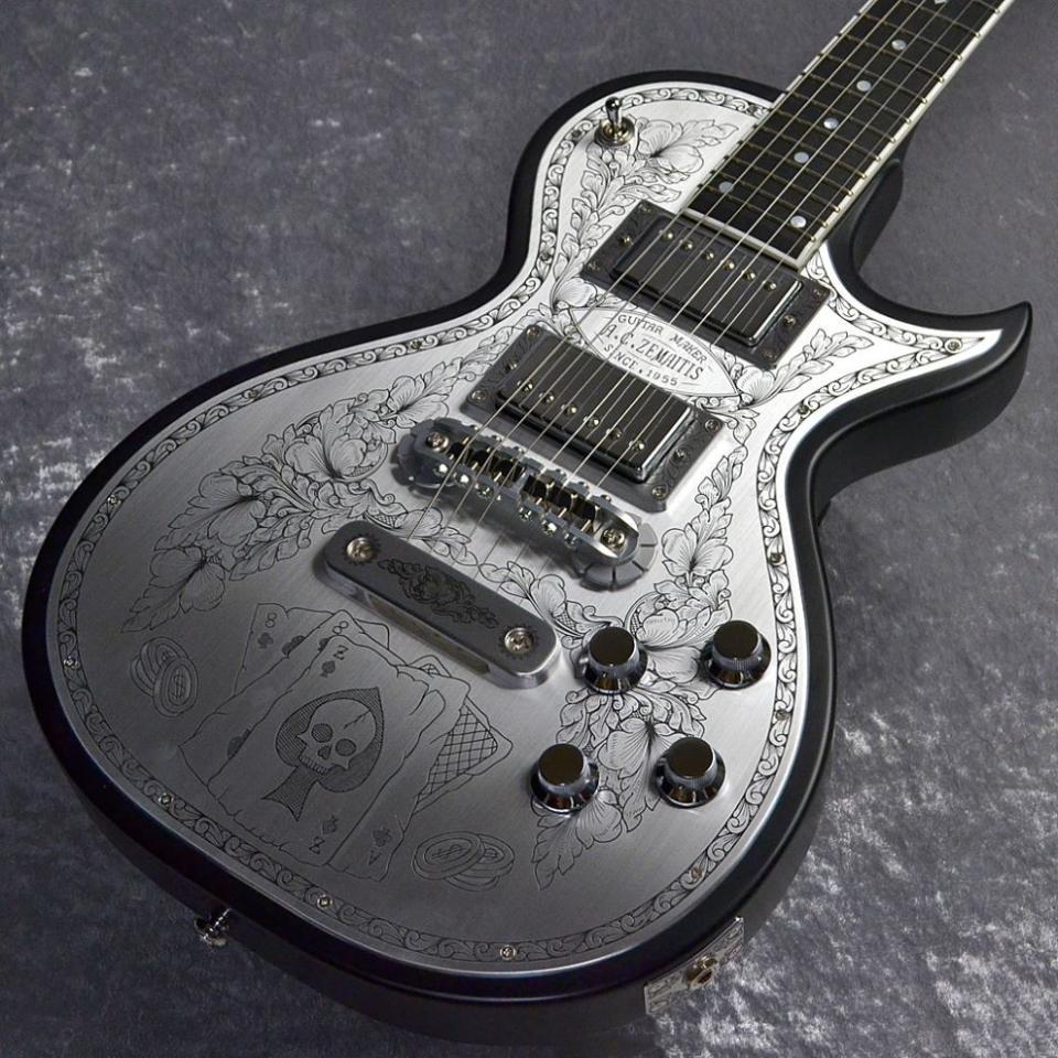 ボディ・トップのアルミ合金のプレートはゼマイティスらしいリーフ柄に加えトランプとコインの彫金装飾を施し、伝統を示す「A. C. ZEMAITIS SINCE 1955」の文字が刻まれたデザインなどクラシックなルックスが特徴です。ゼマイティス・オリジナルのアルミ合金を使用したブリッジ&テイルピースを搭載し、ゼマイティス独自のトーンを生み出す要素となっています。