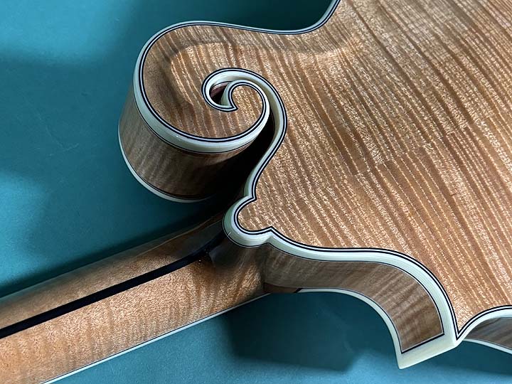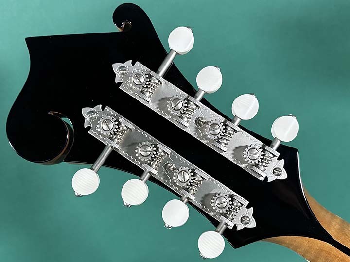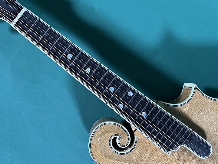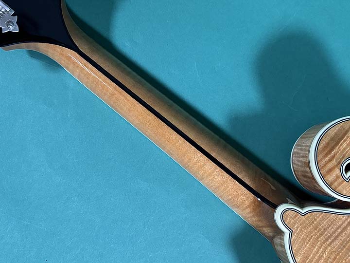 実際に演奏してみるとシャープで歯切れの良いそれでいて、中音域の量感もあって質の高いマンドリンサウンドで奏でられます。ボディーネックとも光沢のあるグロスフィニッシュで仕上げられ高級感たっぷりのマンドリンです。