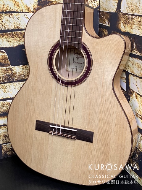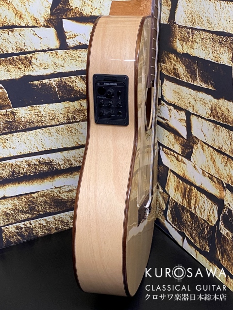 フラメンコに限らず、ボサノヴァやJazzなどにも対応できるエレガットです。ピックアップはピエゾと内臓マイクをブレンドできるタイプで、アコースティックな空気感のある音作りが可能です。
