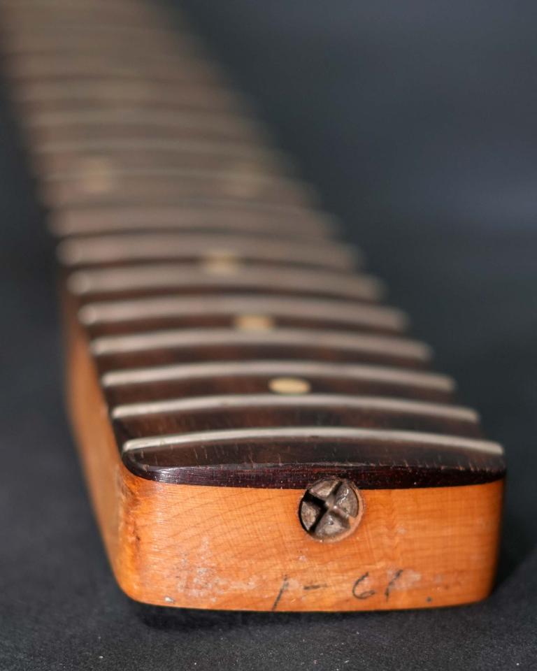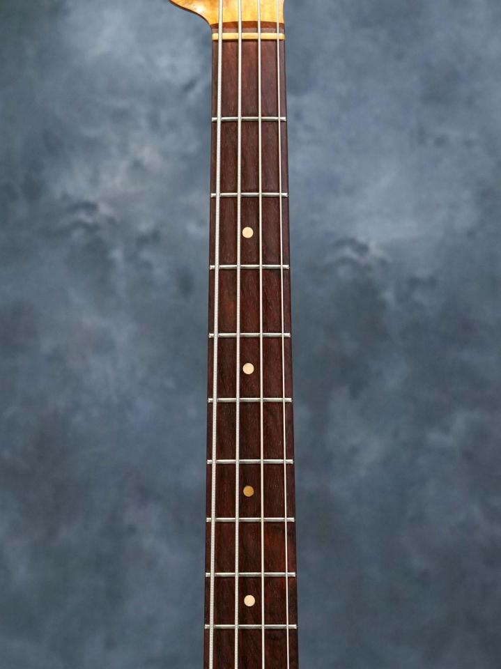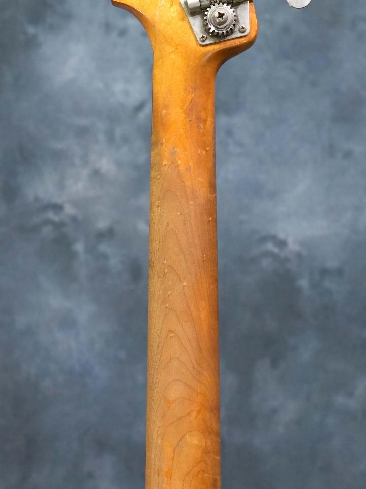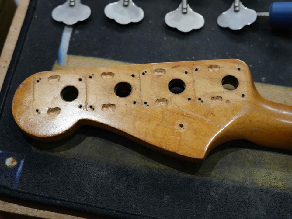 コントロールキャビティが拡張されており、ペグ交換に伴いペグビス穴が追加されていますが、現在はオリジナルペグに戻されています。ナット&フレットは交換されており、ネックはほぼストレートの状態でトラスロッドの効きも良好、交換されたフレットは減りも少なく、ビビりや音詰まりも無く演奏性は良好です。