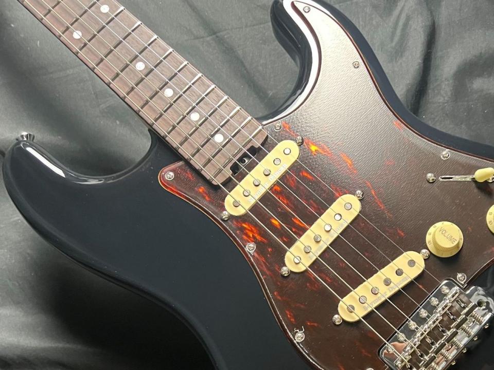 フルサイズのストラトタイプのボディながらセミホロウ構造を採用することにより超軽量を実現したカスタムオーダーモデル。通常甘くなりがちなホロウ構造ですが、通常よりも厚みを増したローズ指板、セイモアダンカン製ピックアップ等によりコシのあるサウンドをキープしました。