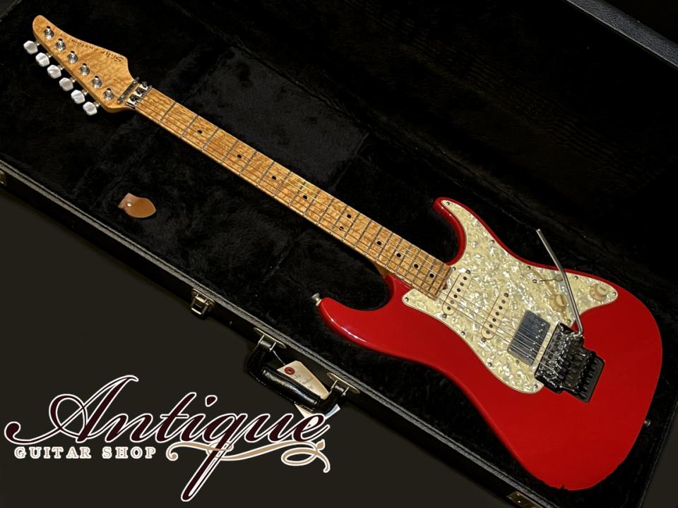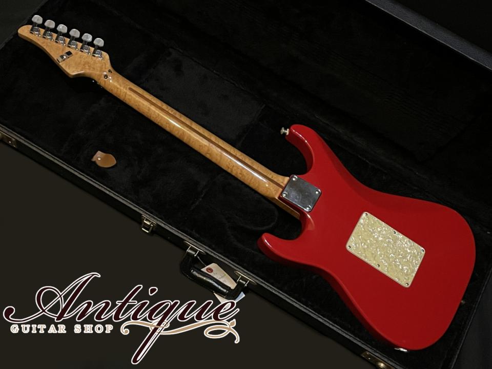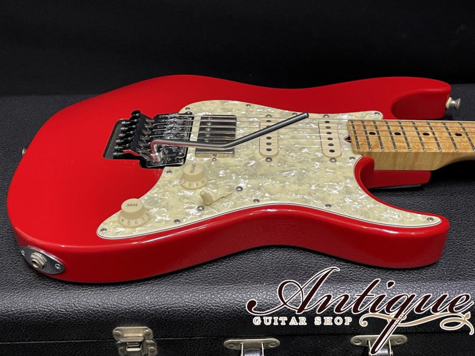 続いて本機のスペックですが、ボディ材には厳選されたアルダー材が採用され、当時のロックフリークを感じさせるレアカラー”Porsche Red”にてフィニッシュ。ネックには現在のカスタムオーダーでは不可能と言っても過言では無い、強烈過ぎる超極上のフィギュアドメイプルが1Pにて採用されており、ワイルドに入ったフレイムキルト、ビッシリと埋め尽くされたバーズアイ、また下の杢目もエキゾチックなフラットソーン(板目取り)となっております。その他として、ヘッドにはこの限定された時期のみとなる”Suhr Custom”のブランドロゴ&シリアル、ブラックドットポジションマーク、6105ミディアムジャンボサイズのツバ出し22F仕様、パールホワイトピックガード、パーロイドボタンのシャーラーM6miniロッキングチューナー、ブリッジはリセス加工の施された希少なオリジナルのフロイドローズトレモロが搭載されております。ネックシェイプは今で言うEven C Slim系0.78””厚のグリッピングにグロスフィニッシュ、ナットワイドは1.65”(≒約41.9mm)、指板ラディアスは12” R、その他指板サイドの丁寧な仕上げやヒールレスカット等の高いクオリティが感じられます。