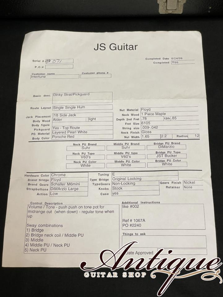 まずこちらの一本のオーダー時の経緯については付属のスペックシートからある程度が読み取れますが、Customer name(注文者名)の欄が『Intertune』となっている事から、外部からのオーダーでは無く、Suhr Guitarsの立ち上げにあたり製作した一本と推測されます。またAdditional Instructions(追加指示項目)には『like #002』の記載がある事からも、独立してすぐのJS Guitarブランドとして2本目に製作した個体を見本として製作された個体という事が分かります。
