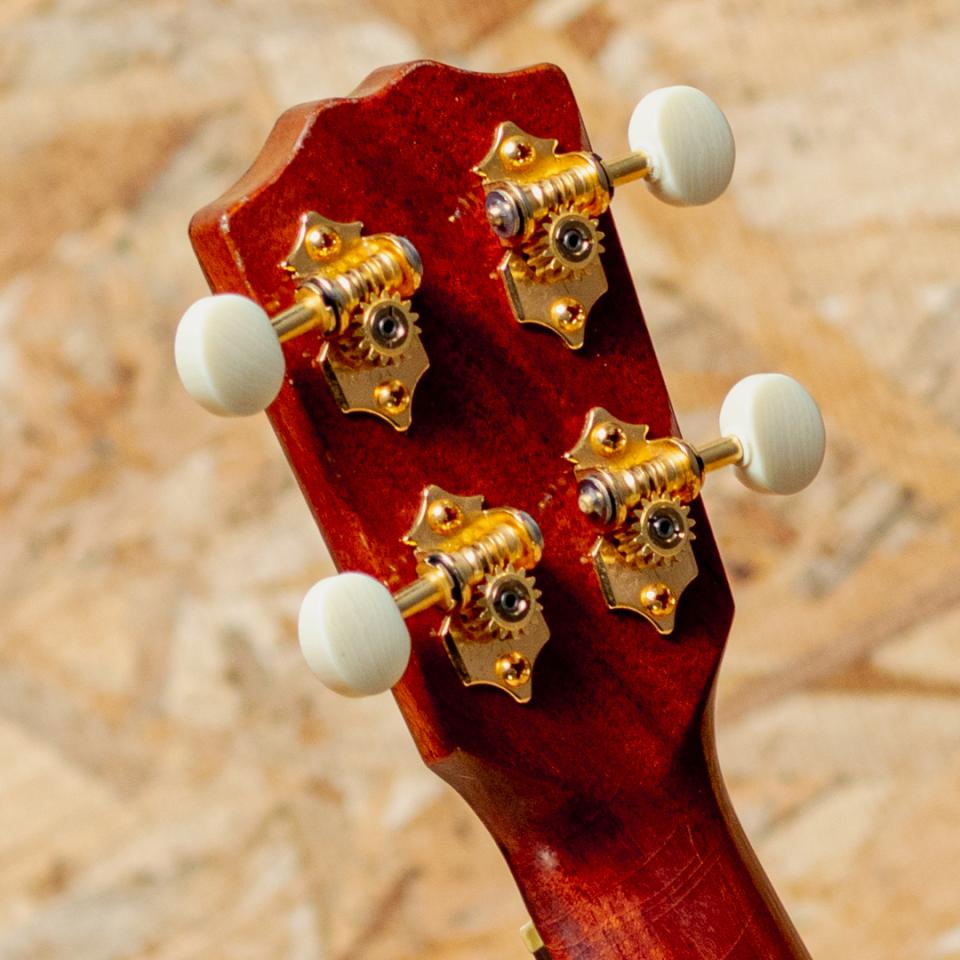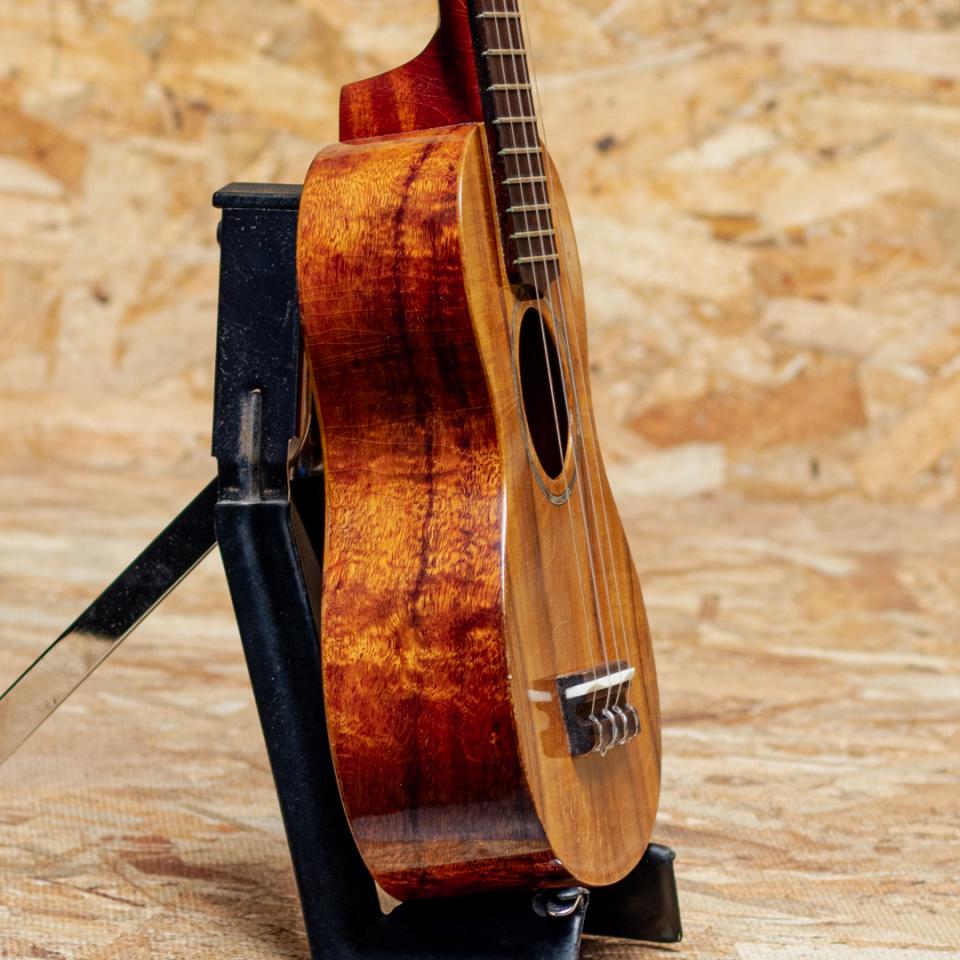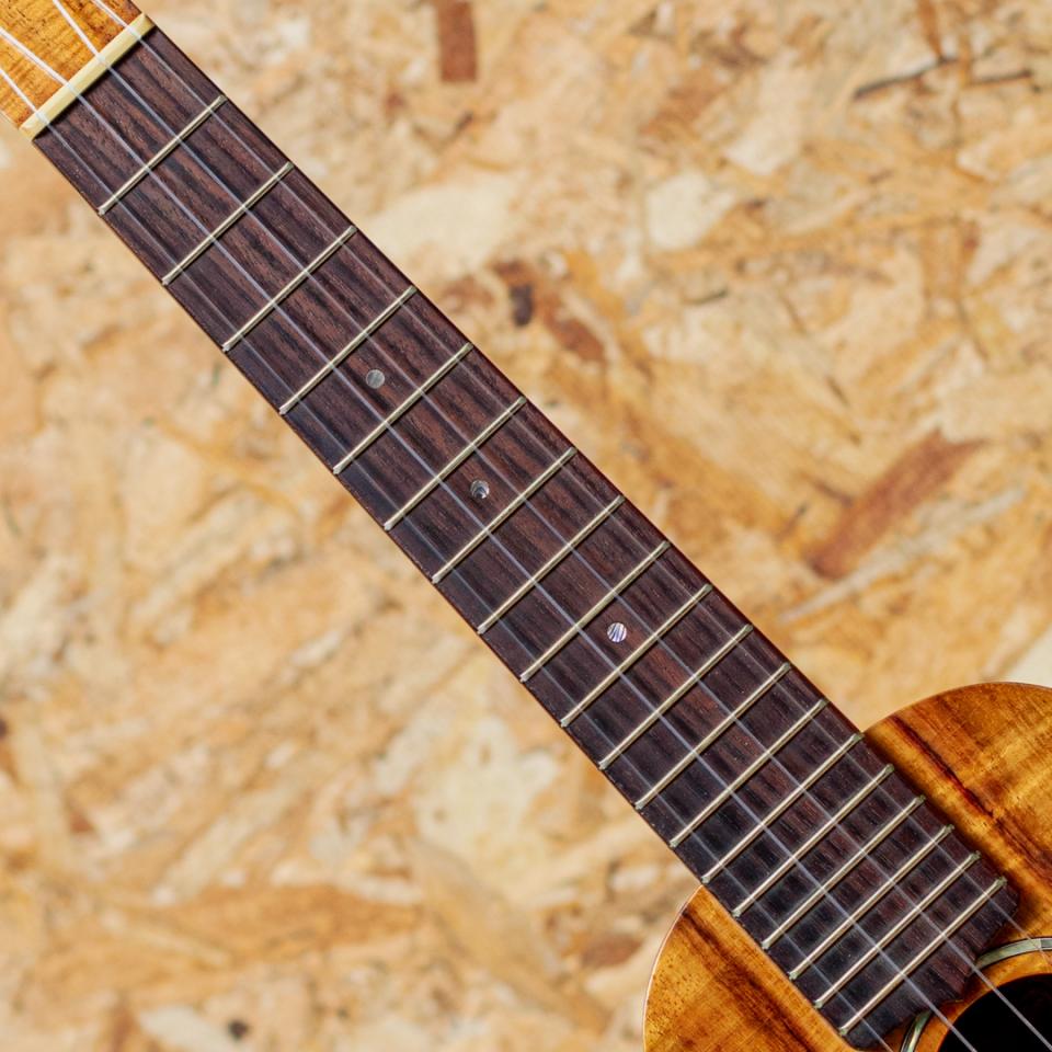 Gストリング社は1993年に設立されたメイド・イン・ハワイブランド本器はきれいな杢のハワイアンコアが使用されたソプラノロングネックモデル2007年製のUSED品。マホガニーネック、ローズウッド指板&ブリッジ、ゴトー製ギアペグ、アバロン指板ドットインレイ、アバロンロゼッタ&ヘッドロゴ。現在はアメリカにて手工で製作され、価格も高騰しておりますが、当時はオワフの工房でチームで製造されており、手の届きやすい価格帯にて幅広く展開。たちまち人気を集め、ハワイアン3大ブランドの一つとまで称されていました。ハワイアンコアらしい甘みたっぷりのサウンドで、素朴さと愛らしさも感じるハワイメイドならではの味わい。細かな打痕や全体的にウェザーチェックとトップの沈みが見られますが、演奏性には問題なく、プレイコンディションは良好です。きれいな杢とアバロンが映える良いルックスの1本。ソフトケース付属です。