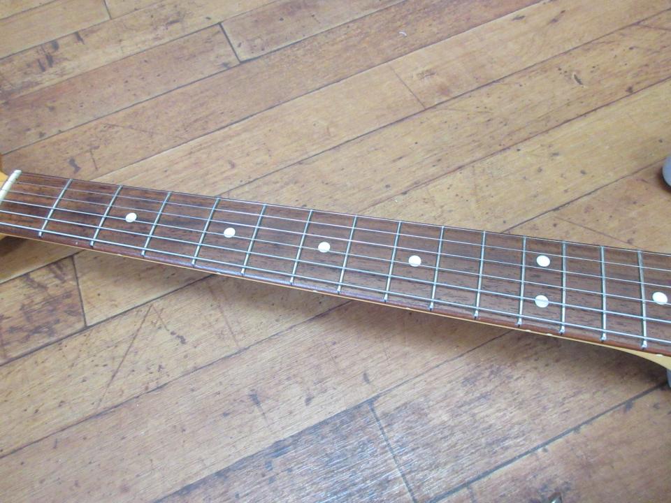 BODYトップには10数か所の打痕(そのうち1か所はミミズが歩いたような長い打痕)、バックには10か所以上の細かい打痕がありますが、いずれも浅く、生地までには至っておりません。わずかにピンクがかった白っぽいUSブロンドカラーのためか、画像には映りづらく、少し離れるとわかりづらい状態ではありますが、気になる方は、ご遠慮いただくか、または、必ずお電話にてお問い合わせください(文章での説明は難しいため)。ネックの状態は良好で、トラスロッドの余裕もあります。フレットは1~3弦の1~10フレットくらいまで押弦による僅かな窪みがありますが、プレイに支障はありません。新設計のピックアップによるものか、非常にスッキリとした”輪郭のよい抜けの良い音”の印象で表現のしやすさに一役かっているように思います。また、ヴィンテージタイプのスモールヘッドネックにかかわらず、トラスロッド差し込み口がヘッド側にあること、セカンドトーンがミドル&リアピックアップに有効になっていること等、気の利いた変更がされているのも注目です。