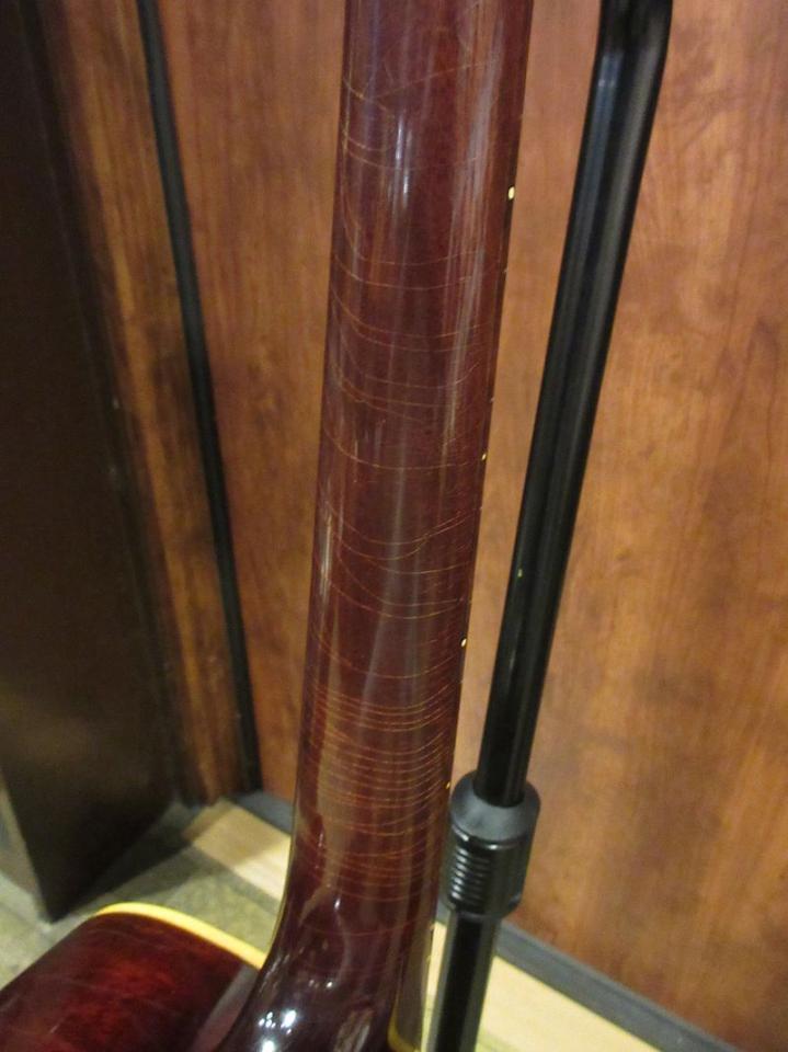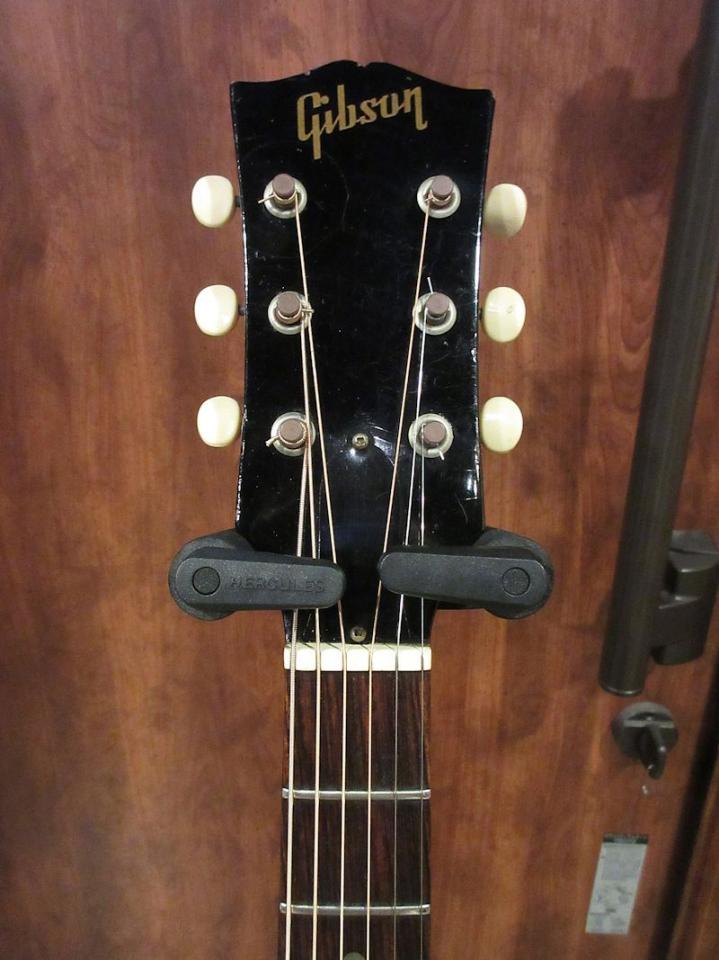 この年代特有の鮮やかなチェリーサンバーストが美しい個体。ナローピッチに移行後の個体ですが、ネックは程よく太さがあり、とても弾きやすいシェイプです。アジャスタブルブリッジ特有の音圧もありつつ、この個体はふくよかな柔らかい鳴り感も併せ持った良個体。指弾き、ストロークプレイ共にストレスなくこなしてくれます。ボディートップ1弦側下部にクラックがありますが、内部にクリートを貼り付け非常に丁寧に修理されております。それ以外の木部修理はなく、塗装の艶も残った良いコンディションです。この年代に使われていたゴトー製オープンバックペグは使いやすいクルーソン3連ペグに交換され(同年代のダブルラインクルーソンペグ)実用的なのも高ポイント。ボディーバックヒール下にストラップピンが増設されておりますが、ピックアップ取り付け跡などはごさいません。ネックコンディションは非常に良く、トラスロッドも双方向に余裕あり。近年製ギブソンハードケース付属。