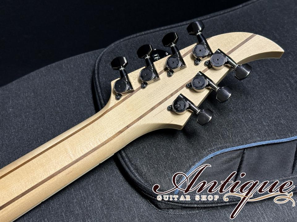 まずそのスペックとしては、ボディシェイプはハイエンドらしいディンキースタイルながら、薄っすらとアーチドを描くTATカーブトップシェイプにて、ボディ材にはネックとほぼ同じ幅のメイプル材を中央に、その両側にオーストラリアン・ブラックウッド材を配置したMB3ボディ構造。ネックには薄っすらと入ったフィギュアドと硬質材の証ともなるフレックラインが浮かぶ良質なメイプル材にて、間にウォルナットストライプを入れる事で更に剛性を上げた5P構造。指板は古くから上位グレードのモデルに採用される高級材であるエボニー。フィニッシュにはトランスカラーでありながら見る角度によって様々なカラー変化を伴うダントツ人気のTranslucent Spectrum Blueフィニッシュ。ヘッドはキャパリソン独自のスタイルであるデビルズ・テール(Devil’s Tail=悪魔の尻尾)と呼ばれる形状にてブランドロゴと併せてDellinger Prominenceのロゴが入っております。ヘッド角は15度にてナットにしっかりと弦の張力がかかることで張りのある弦振動が得られるよう設計されております。その他としては、チューナーは精度の高いGotoh製のHAPチューナー(SG381-07 H.A.P.)、リセス加工の施されたSchaller製フロイドローズ(Lockmeister® 7)、特徴的な指板のインレイワークは、斜めの楕円形に各フレット数を意味する時間が刻まれたクロック・インレイが鮮やかなマザーオブパールとアバロンで施されており、唯一無二のルックスとなっております。細部スペックとしては、ナット幅約49mmの7弦仕様、648mm(25 1/2”)ロングスケール、薄型の台形に近いCaparison7のテクニカルなネックプロフィール、指板ラディアスは350-400Rのフラットなコンパウンドラディアスという仕様にてジャクソンの影響を大きく感じさせ、押弦に有利なステンレス・スティールのジャンボフレット24F仕様、最終フレットまでスムースなプレイを可能とする大きなカッタウェイシェイプと相まって、テクニカルな演奏を強力にバックアップします。