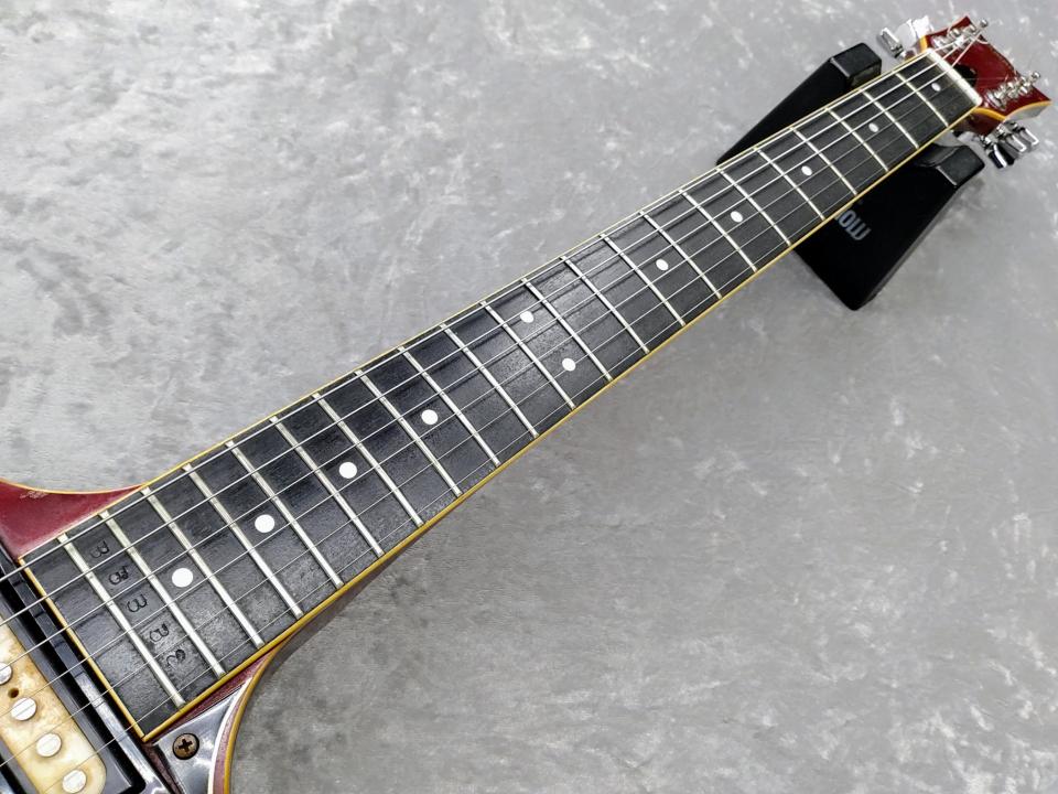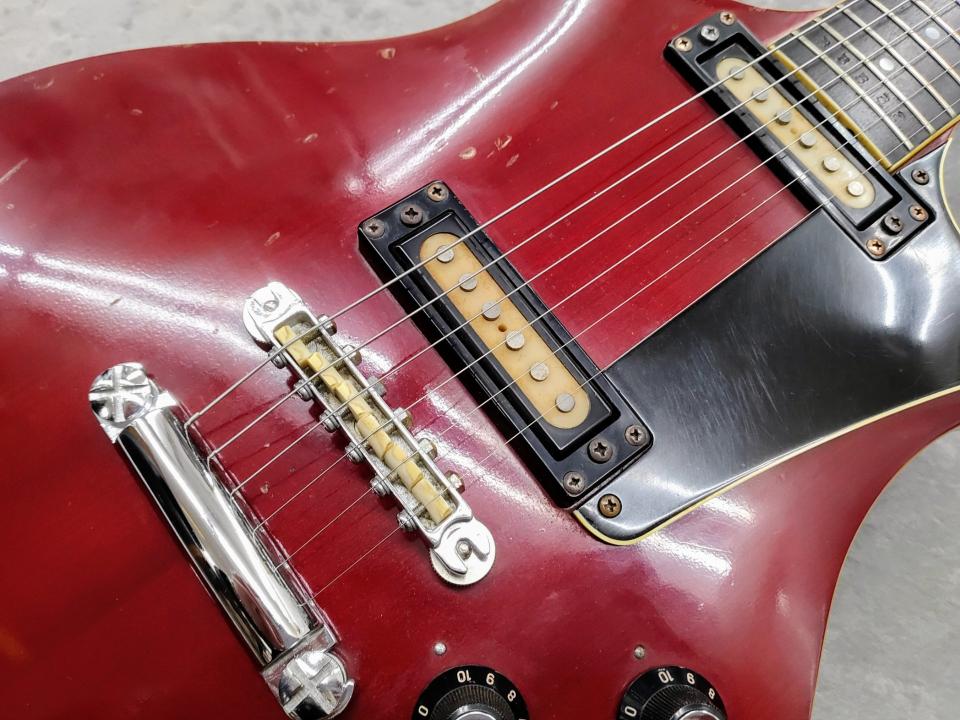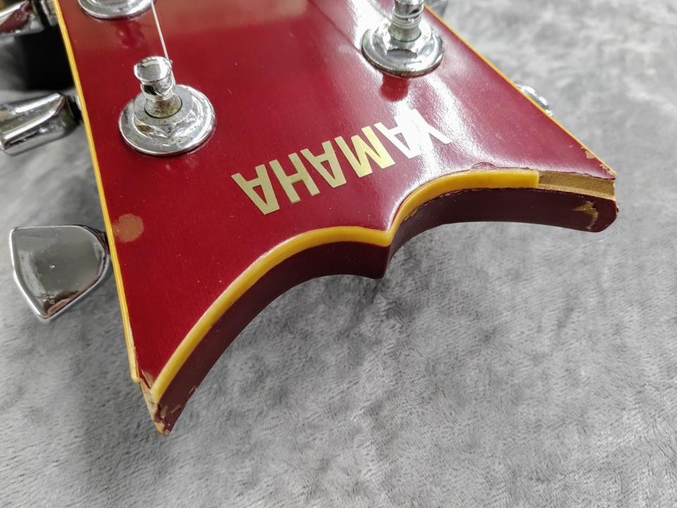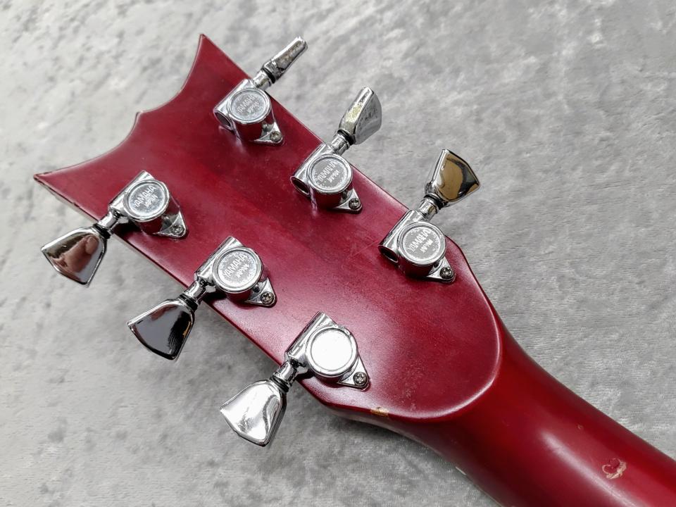 1970年代に登場し短命に終わったヤマハSXシリーズの上位モデルSX-125、シリアルナンバーより1973年製です。ギターには珍しい桂材を使用した特徴的なダブルカッタウェイボディ、指板には黒々としたエボニー材を使用。オリジナルのシングルピックアップ×2と個性的デザインのピックガードを備えたビザール感漂うルックスです。