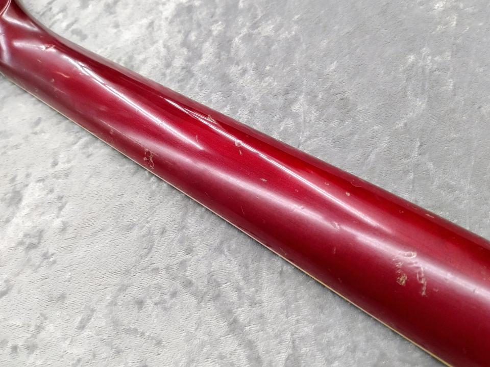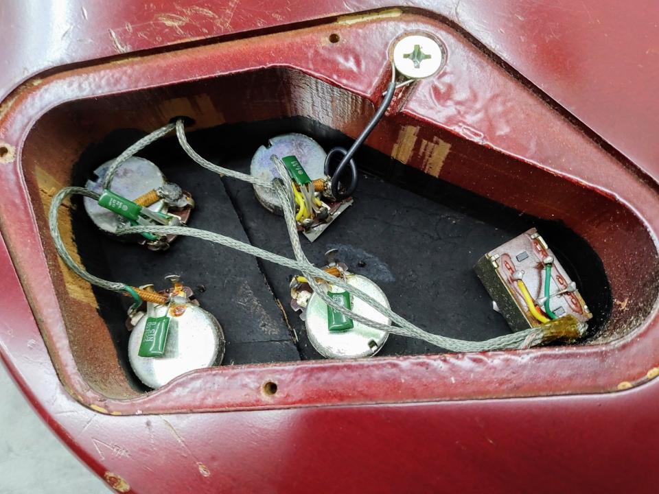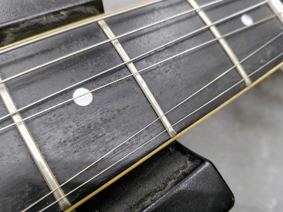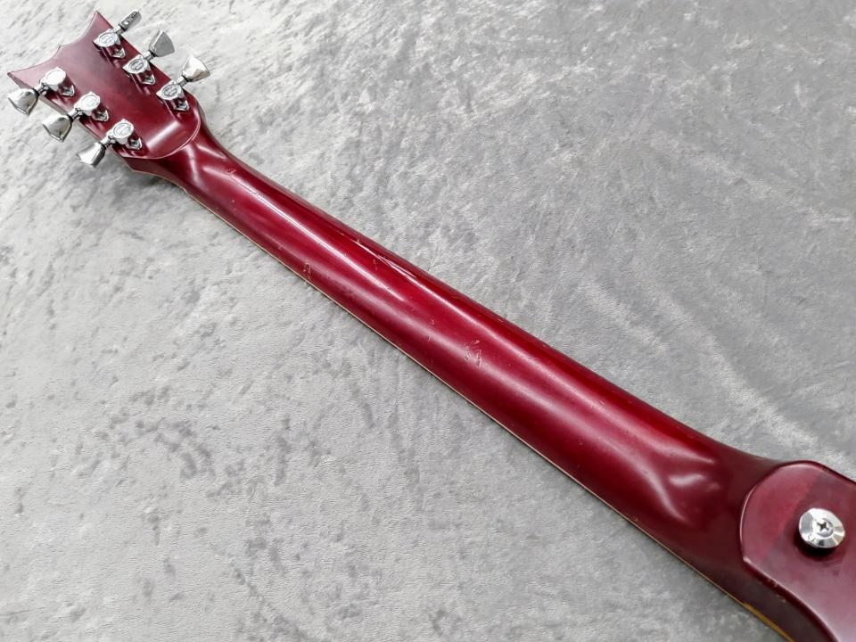 全体的に年代なりの傷が多数、ヘッド先端に欠け、パーツやネジ類に錆びやくすみがあります。ナットが交換されている以外は交換パーツはないと思われ、フレットは過去にすり合わせが為されており5割程度残。ネック状態良好でトラスロッドの可動も問題ありませんが、フレットの状態が悪く6弦の7フレット辺り~ハイポジションにかけてつまりやビビりの出るポジションがあります。その他、ブリッジに湾曲、コントロール類に若干のガリがあります。