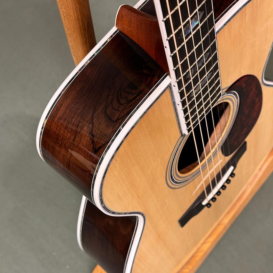 本機は、ヤイリフォーク(YF)をベースに、YW-1000相当の木材グレードを採用し、さらにインレイワークを追加した完全特注モデルです。