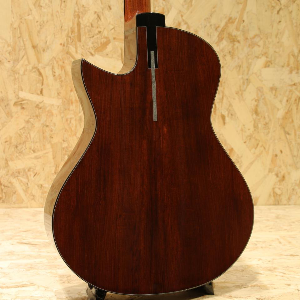 ドイツの優れた新進気鋭ルシアー、MAX SPOHN氏によるブランド"Sporn Guitars"。彼は子どもの頃演奏を志すより前にギターを手に取り、音楽を楽しんでいたとの事。美術教師の父を持つSPOHN氏は幼い頃より想像をし、デザインを起こし作り上げるというプロセスが日課で常にクリエイティブな環境に触れてきた日々だった言います。徐々にその志向は木材を使った作業の可能性に惹かれ、幼き頃から磨き上げ続けたアートへの愛情と木材を組み合わせて作るギター製作移り変わりました。やがてその情熱はヴェストザクセン大学マルクノイキルヒェン校での集中的な研究と、長年の個人的な研究と実験によって形作られ、プロのギター製作家としての扉を開きました。SPOHN氏の魅力の柱とも言える2本の柱は幼き頃から英才的に育て上げられた芸術センスのあるデザイン性とギター製作における技術的な木工センスとその設計。アーティストとしての感性を生かして、商業ギャラリーと美術ギャラリーの両方を定期的に訪れ、新しいデザインのインスピレーションを得ています。またトップ・オブ・ザ・ルシアーの異名を持つ、アーヴィン・ソモジの著書「レスポンシブ・ギター」に始まり、ソモジ氏の3番弟子とも言われるレイモンド・クラウト氏の講義にも参加。大きなインスパイアを受け、彼のアイデンティティーの大きなエッセンスとなっています。本器はOMシェイプをベース、12Fジョイントにて製作された1本。マスターグレードスイスムーンスプルーストップ、マスターグレードマダガスカルローズサイドバック、ホンジュラスマホガニーネック、エボニー指板&ブリッジ、シャーラー製オープンブラスチューナー、カスタムインレイがあしらわれたスプルースヘッドプレート、アーティスティックなアートのロゼッタ、バック面上面にもオリジナルのアートワークがほどこされています。モディファイドスタイルのXブレイシング、スキャロップドナット。フォルム、木材のチョイス、色使い、アートワークのセンスどれも切り口が秀逸でまず見た目の美しさがとても印象的。サウンドはクリアで艶やか、澄みきった清流のような印象の中に奥深さを感じさせるサウンドのコシ。取り巻く倍音が美しくギターの美しさとマッチします。くびれが深くやや小ぶりの印象を持つOMサイズですのでOOをご検討の方にもぜひお手に取ってもらいたい一品。国内では中々お目に掛かれないルシアーです。ぜひお手に取ってお試し下さい。Bam製ハードケース付属。