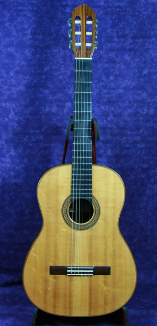 このギターのスペックは、表面板はベアクローの入った迫力のあるジャーマンスプルースでサイドバックはインディアンローズウッドです。 ネック材には温度・湿度の変化があっても収縮しにくいマホガニーを使い、頑丈なスペイン式一本棹方式でボディーとジョイントをしています。指板はエボニーです。ブリッジとヘッドの飾り板はインディアンローズウッドです。塗装はラッカーです。