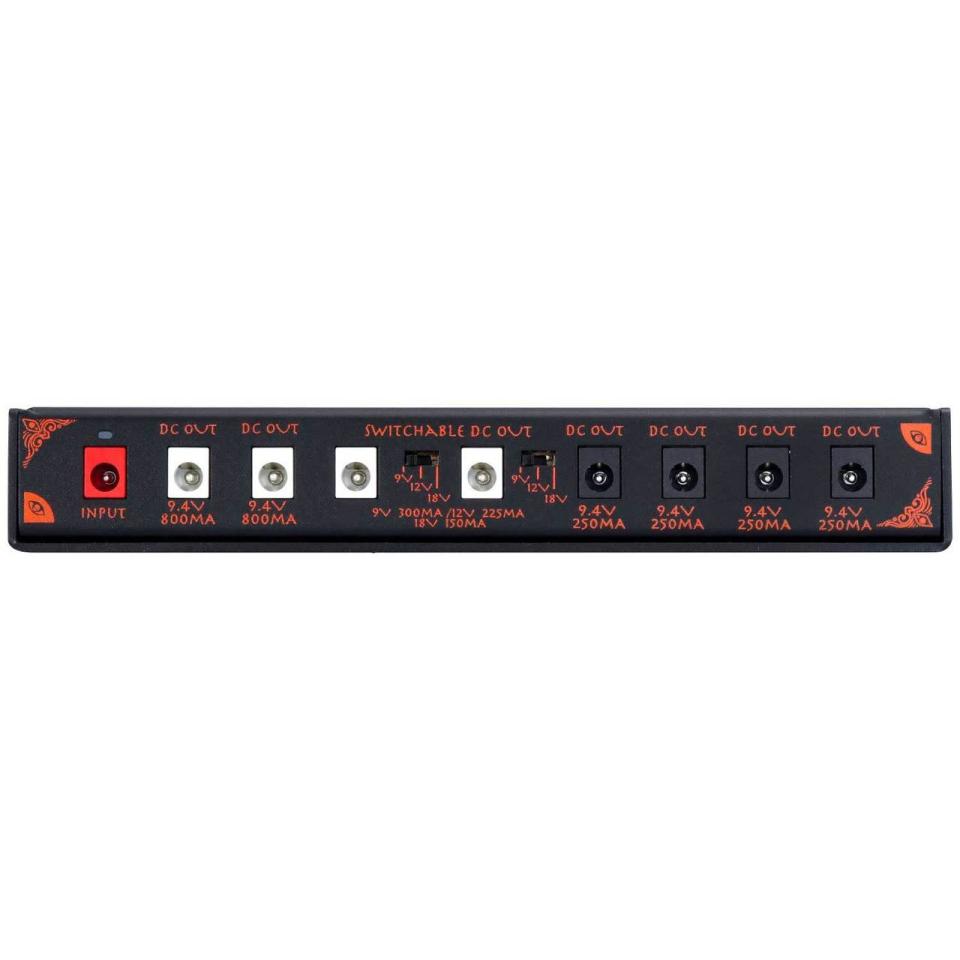 "筐体をペダルライザーとして使用可能なパワーサプライです。アーティスト高松浩史様(THE NOVEMBERS)による「ペダルライザー型のパワーサプライがあれば」というアイディアをブラッシュアップし、独自のパワーサプライに仕上げました。全ポートはグラウンドまで完全に個別にしたフルアイソレート回路。9.4V 250mA 出力を4 系統、9.4V 800mA 出力のポートを2 系統9V500mA/12V375mA/18V250mAを切り替え可能なポートを2系統装備し、要求電圧の面でも幅広くカバー。9.4V出力端子は無負荷時供給電圧を約9.8V (最適環境下において)に、高負荷時でも9.4V を確保出来るよう設定。特にDistortionやOverdrive系のペダルで音に張りと厚みが生まれ、ブライトネスも上がる効果も期待できます。堅牢な筐体にノイズ処理を施し、上部にペダルを乗せてペダルライザーとして使用可能な為、ボード内での省スペース化に大いに貢献します。筐体自体を放熱板として使用する機構を採用しDC出力最大消費電力27W (※Wのおよその計算法としてV×Aとする)の容量を確保。多くのコンパクトペダルを設置する中型のボード構成におすすめです。