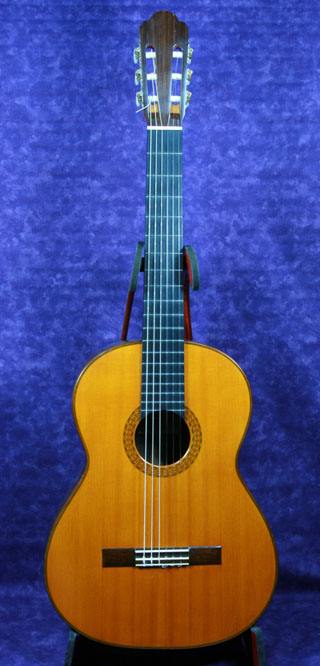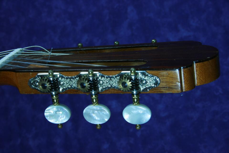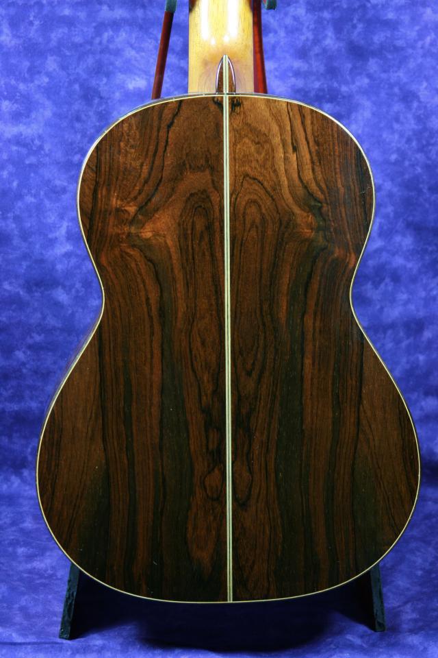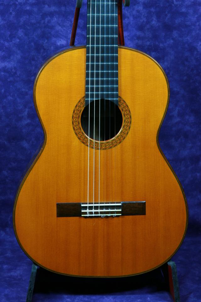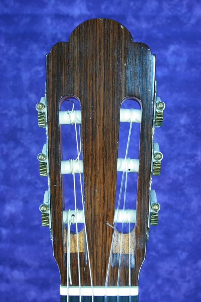 このギターのスペックは、ジャーマンスプルースの表面板にサイドバックはハカランダです。ネックはセドロのスペイン式一本棹方式でジョイントされています。指板はエボニーです。ブリッジはハカランダでヘッドの飾り板はインディアンローズウッドです。糸巻きは、ロジャースに変更されています。塗装はセラックのタンポ塗りです。