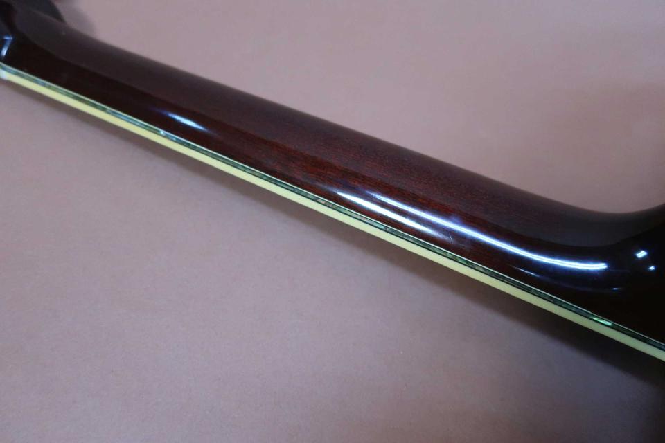 状態はヘッドの3弦ペグのブッシュ辺りに薄く軽微な塗装浮きが見られますが剥がれたり割れたりなどはありません。また入荷前にM工房にて、よく見られるナット脇のバインディングの縮みを1弦ナット脇約1.5mmほど足して綺麗にされtれおります。全体的にも使用感が少なく、トップは、N.MINT コンディションで新品同様の素晴らしい状態を保っており、サイドやバック、ネック裏も綺麗です。またブリッジ浮きやトップの膨らみなども見られず、新品同様のコンディションを保った極上品です。またネックヒールのピン打ちやピックアップの取付履歴も無く、木部のクラックや木部の修復歴も見受けられません。弦長約645.2mm、ナット幅が約44.5mm、弦高は12F6弦約2.5mm、1弦約2mm、サドルの余裕も見られ微調整も可能で、少しキツめですがトラスロッドに余裕もありネックを含めプレヤビリティも良好です。当時のオリジナルハードケースも付属しております。全世界で限定50本で日本への入荷本数はごく僅かな稀少モデルです。
