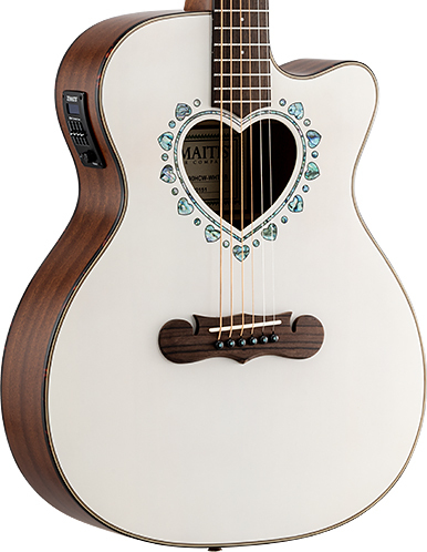ハート型サウンドホールのオーケストラ・モデルのCAF-90Hとオーケストラ・カッタウェイ・モデルのCAF-90HCWは、マザー・オブ・パールのダイヤモンド・インレイが輝く特徴的なヘッドストックを持ったマホガニー・ネックにローズウッド・フィンガーボードを採用した20フレット仕様の14フレット・ジョイントとなっています。ゼマイティスの伝統的なハート型のサウンドホール、その周縁に施されたアバロン柄のハートをちりばめたロゼッタ、マスターシュ・ブリッジのオリジナル・デザインは、非常に魅力的です。トップ・ブレイシングはサウンドホールの形状やボディーのサイズを考慮して、最大限の鳴りを引き出すためにフォワードXブレイシングを採用しています。ボディー・トップは板材の時に真空状態で熱を加えることで余分な水分やミネラルを取り除いたソリッド・スプルースを使用し、サイドとバックにはサペリを用いて狂いの出にくい安定したボディ剛性を実現しました。ヘッドストックの突板にはローズウッドを使用し、ペグのボタンはパーロイドを採用しています。ボディー・サイドには4バンドEQとクロマティック・チューナー機能を持ったプリアンプを搭載し、お好みのトーンでアンプなどの外部機器に出力できます。カラーは、アンティーク・フィニッシュのホワイトです。
