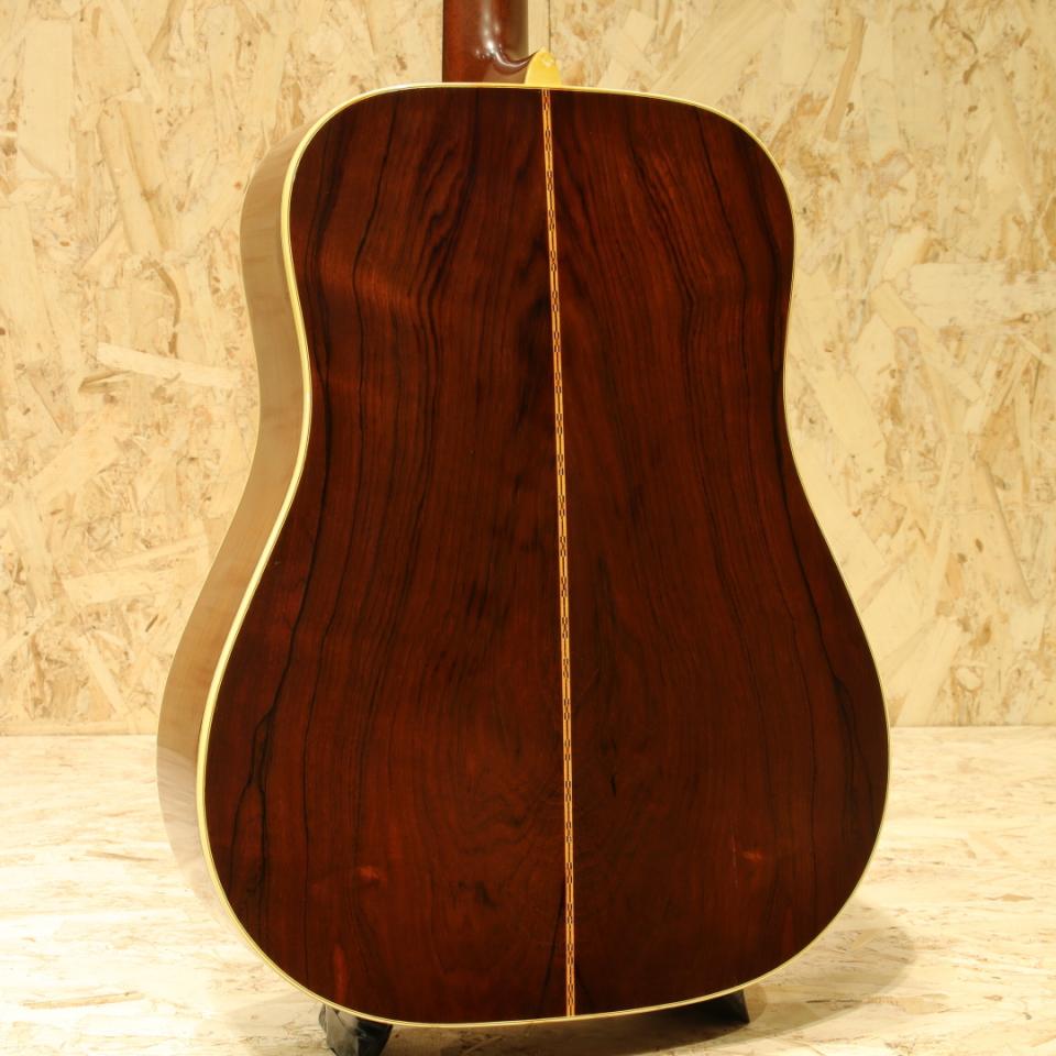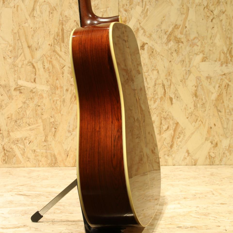 1960年代後半に製造されたとみられるエンプロイーメイド。本来"MARTIN"ロゴがマウントされていない物が一般的ですが、どのような経緯でヘッドデカールがつけられたかは不明です。従業員独自の発想で手掛けられたエンプロイーモデルのため、一部改良されたブレイシング形状やナット幅形状など独自の加工は見られますが、指板のエッジ処理やサイドの割れ止め素材、同時期マーティン社特有のフィニッシュの曇りなど、その他各所で違和感なく、マーティンのそれと判断できると思います。ドレッド―ノートボディーをベースとしたシェイドトップカラーフィニッシュ、スプルーストップ、重厚なハカランダサイドバック、エボニー指板&ブリッジ、マホガニーネック、ドット指板ポジション、白黒トリム&ロゼッタ、ホワイトセルバインディング、USAグローバーミルクボトルロトマチックチューナー、ピックガードはオーバーサイズのブラックガードに交換、41mmナットワイド,ノンスキャロップドXブレイシング、ローズウッドブリッジプレート(大きくない)にボールエンドがかかる部分には真鍮のプレートがマウントされています。弾け感のよい立ち上がり、重厚でやや粘りのあるサウンドは通常のD28に比べ、ブレイシング質量を少なくしている部分が影響している印象。D-35とD-28の60sのサウンドをミックスしたようなハイブリッドなサウンド感です。大変程度がよくネックは綺麗なストレート、日本人好みの細身のグリップでサドルマージンも高く余裕を持たせており、現状も大変弾きやすくセットアップされています。バックやや6弦側ボトム手前付近に指でなぞって引っかかる塗装のクラックが見られますが、溶剤を垂らしてのチェックでも木部までは浸透しておらず、表面、裏面共にグルーの散布もないため割れではありません。トップの下部ボトム付近にも小さな米粒ほどの地肌が見える打痕がありますが軽微な打痕で手直しの必要はありません。その他はまばらに塗装のチェックが見られますが塗膜もしっかりとキープされており、とても良いコンディションをキープしています。ハカランダモノの珍しい一品をお探しの方にはぜひお勧めしたいコレクタブルな一品。汎用ハードケースが付属します。