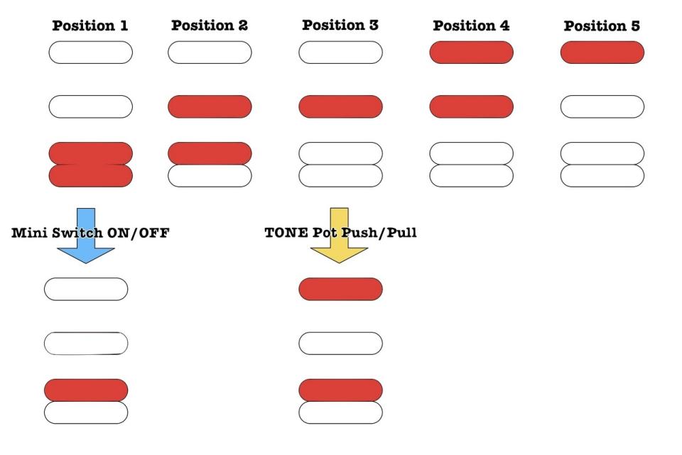 TONEを引き上げることにより、センターPU選択時の役割を変更。フロントPU+コイルタップしたリアPUをMIXしたテレキャスター風のサウンドが出力可能となります。