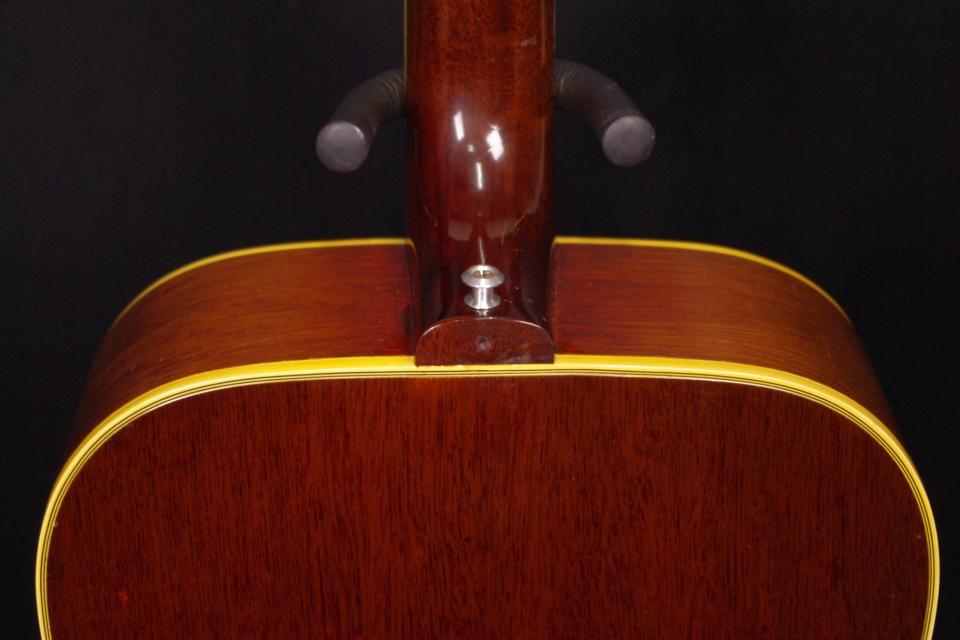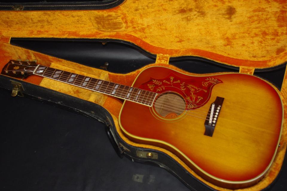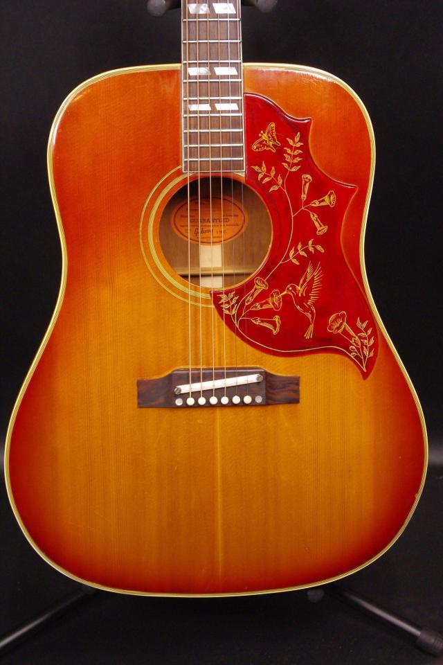 1960年代初期スペックのハミングバードが味わい深いフェードチェリーサンバーストで入荷しました!!トップはスプルース、サイドバックにはマホガニー、指板とブリッジにはハカランダを採用、17度ヘッド角度、ナット幅は約42mmのレギュラーネックの初期スペックでナローネックと比べるとレンジが広くパワフルです!!シリアルナンバーから1965年に生産された個体でクルーソンペグ、ピックガード、ブリッジはオリジナルで残っています。サドルはレプリカセラミックに交換しています。ネックヒールへはストラップピンの取り付け、またストラップピンの穴埋め跡が確認できます。ピックアップの取り付け加工はございません。傷、ウェザーチェックはありますが全体的に綺麗に残っていました。調弦時のネックアングルは僅かな反りが見れますが適正です。トラスロッドは以前に回して調整していますが問題なく機能します。フレットは交換されており高さがあり今後も安心です。弦高もハイポジションまで押さえやすく調整しています。サドルの上下にも余裕がありお好みで微調整も可能です。アジャスタブルブリッジ、ロングスケールの影響からザクザクとキレがよく特にストロークで気持ちよく抜けてくれますね!!是非この機会にお試しください。ケースはダメージ補修箇所がありますがオリジナルハードケース付きです。